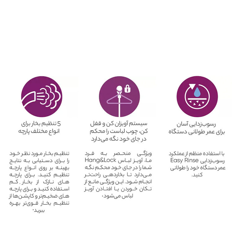 قابل استفاده با اب شهری.دارای میز اتو.قابلیت اضافه کردن عطر یا بوی دلخواه به سری بخارگر.