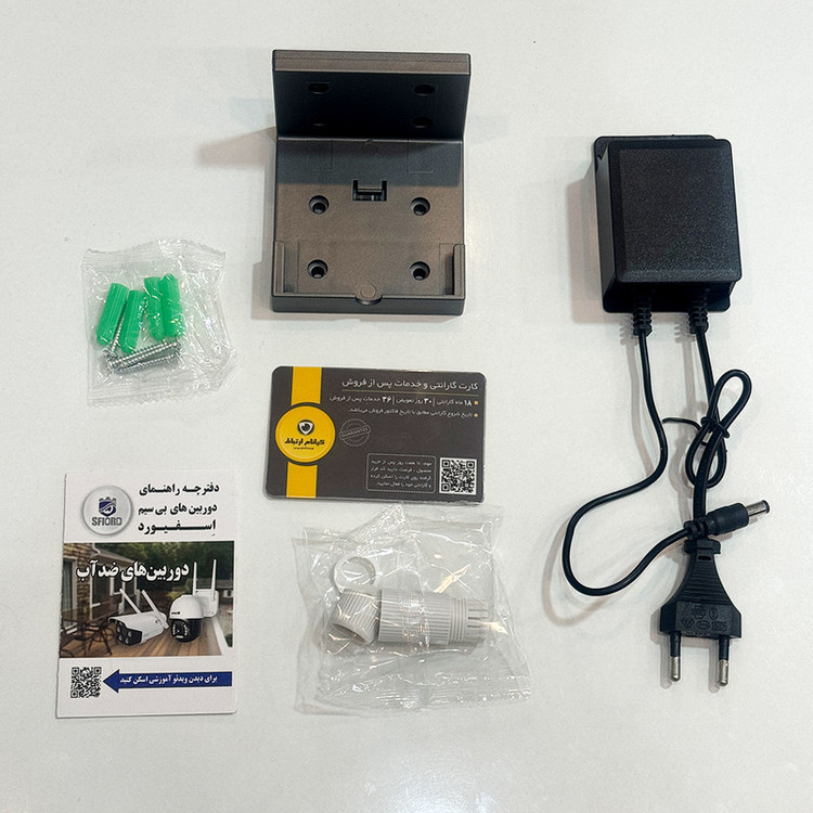 اقلام همراه : پایه نصب دیواری، آداپتور، کارت گارانتی، دفترچه راهنمای فارسی، پیچ و رول پلاک نصب، کاور ضد آب کابل شبکه