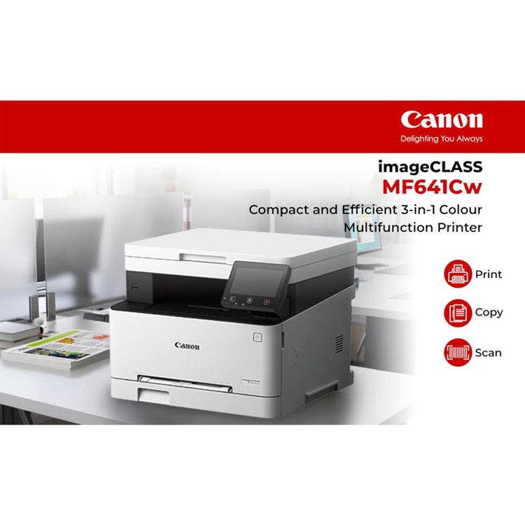 مدل «MF641Cw» از سری i-SENSYS ازجمله پرینترهای لیزری رنگی شرکت «کانن» (Canon) است. این دستگاه در کنار قابلیت چاپ رنگی ، میتواند اسناد را به طور رنگی کپی، اسکن کند ، همچنین تمامی موبایلها و تبلتهای اپل ، اندرویدی و .. میتوانند بسهولت به آن متصل شوند و اسناد مورد نیاز را پرینت کنند، علاوه بر آن امکان اتصال USB FLASH وچاپ فایلها از روی فلش و اسکن مدارک و ذخیره روی فلش را داراست، از همینرو یکی از همهفنحریف حوزهی پرینترها محسوب میشود. این محصول به یک سینی 250 برگی و یک اسلات ورودی کاغذ تک برگی چند منظوره مجهز شده است؛ این دو ورودی کاغذ میتوانند نیازهای یک دفتر اداری با حجم کاری کم یا متوسط را تامین کنند، همچنین نمایشگر بزرگ رنگی لمسی این دستگاه امکان استفاده آسانتر از دستگاه و بکارگیری اپلیکیشنهای فوق العاده جالب موجود در دستگاه را براحتی میسر میسازد. مدل I-SENSYS MF641Cw رزولوشن چاپی 1200× 1200 dpi دارد؛ با این رزولوشن، اسناد و تصاویر با بالاترین کیفیت لیزری چاپ میشوند. چاپ رنگی این دستگاه همانند دیگر پرینترهای لیزری، برای چاپ بروشور و چارتها مناسب است و برای چاپ عکس پیشنهاد نمیشود. اسکنر قوی این پرینتر شرکت کانن سند را با سرعت 27 صفحه در دقیقه اسکن میکند که کاربر میتواند اسناد را باکیفیت قابل ملاحظهای(تا 9600 dpi) و زمان بسیار کوتاه به فایل دیجیتالی تبدیل کند. مجهز شدن این دستگاه به اسکنر، قابلیت کپی را نیز فراهم کرده است؛ مدل I-SENSYS MF641Cw میتواند اسناد را با رزولوشن 600 × 600 dpi و با سرعت تا 18 برگ دقیقه کپی کند. اتصالات این پرینتر چندکاره لیزری رنگی شامل USB، شبکه و وایرلس میشود. همچنین کارتریجهای با ظرفیت چاپ بیشتر به صورت آپشنال میسر است که باید جداگانه خریداری شوند.
