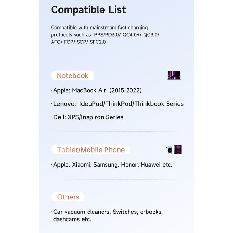 USB-A: 5V⎓3A, 9V⎓3A, 12V⎓2.5A