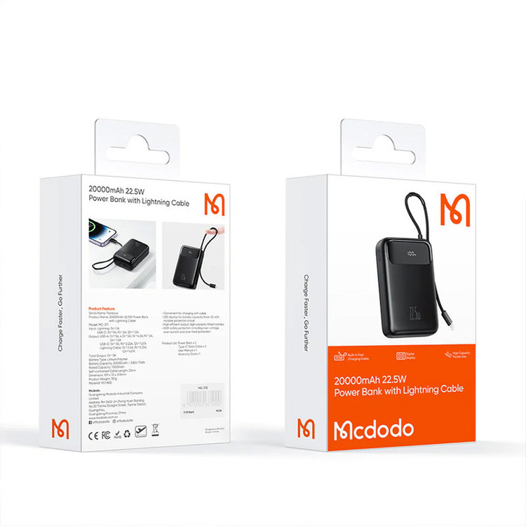 پاوربانک مک دودو Mcdodo ch-372 22.5W PD+QC 20000mAh با کابل USB-C داخلی و نمایشگر دیجیتال را معرفی می کنیم. این پاوربانک در هنگام شارژ دستگاه های شما در حال حرکت، یک نیروگاه است. با طراحی شیک و جمع و جور خود، به راحتی در جیب یا کیف شما قرار می گیرد و حمل آن را راحت می کند.