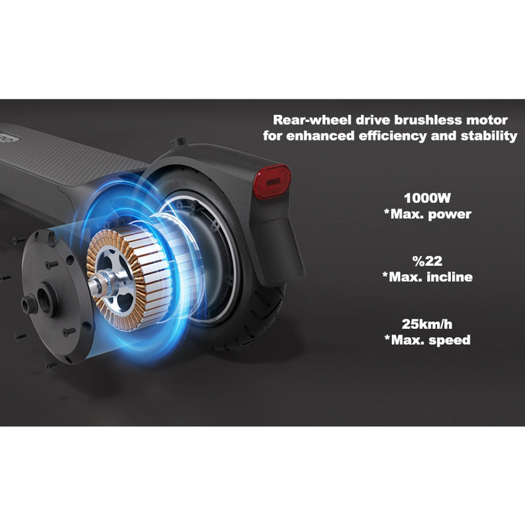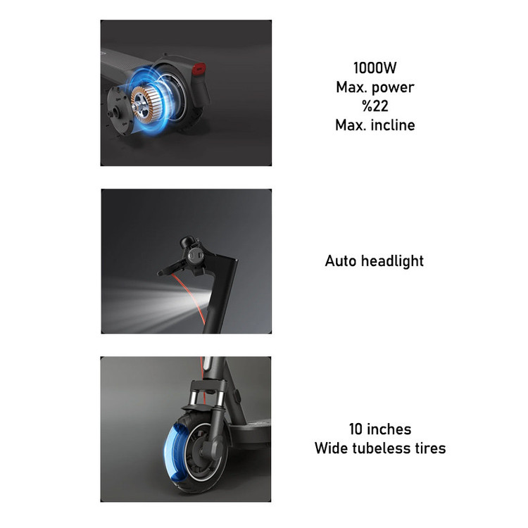 حداکثر توان 400 وات | ماکسیمم سرعت 25km/h | پیمایش 60km | مناسب برای افراد ۱۶ تا ۵۰ ساله | بیشینه وزن قابل تحمل 120kg | قابلیت اتصال به برنامه | تایرهای با دوام | استاندارد IPX5 | بلوتوث نسخه 5 | ترمز مکانیکی چرخ جلو و الکتریکی چرخ عقب