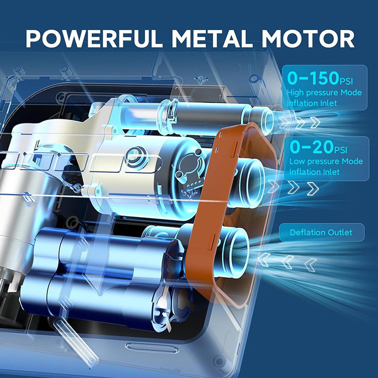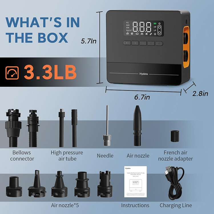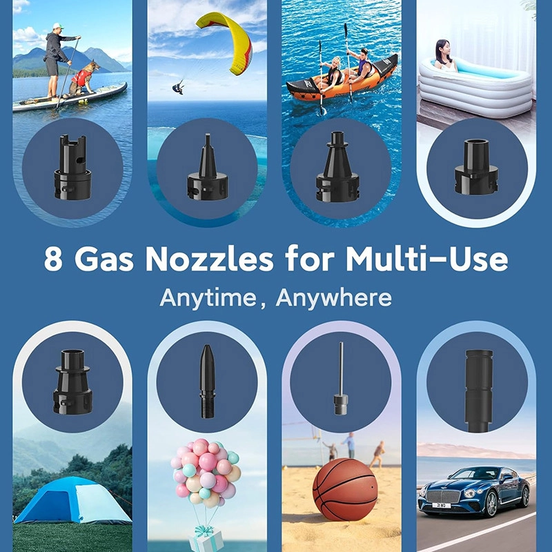اقلام همراه : یک کابل تایپ سی جهت شارژ کردن دستگاه | یک لوله هوا با فشار بالا | کانکتور دم | نازل هوا | سوزن | 5 عدد نازل هوا مختلف | دفترچه راهنما