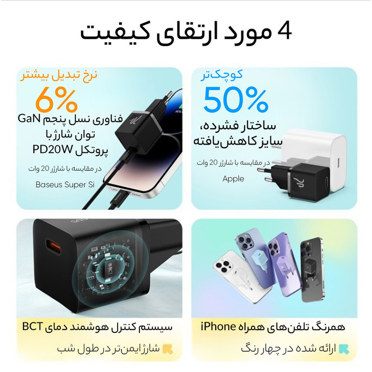 فناوری GaN برای ارائه شارژ سریع | کنترل دما | پشتیبانی از پروتکل های PD3.0+، QC4 و PPS | جلوگیری از ورود جریان بیش از حد | حفاظت در برابر اتصال کوتاه، OVP، OTP، OLP، OCP، ولتاژ پایین، شارژ بیش از حد، جریان بیش از حد، ولتاژ بیش از حد |