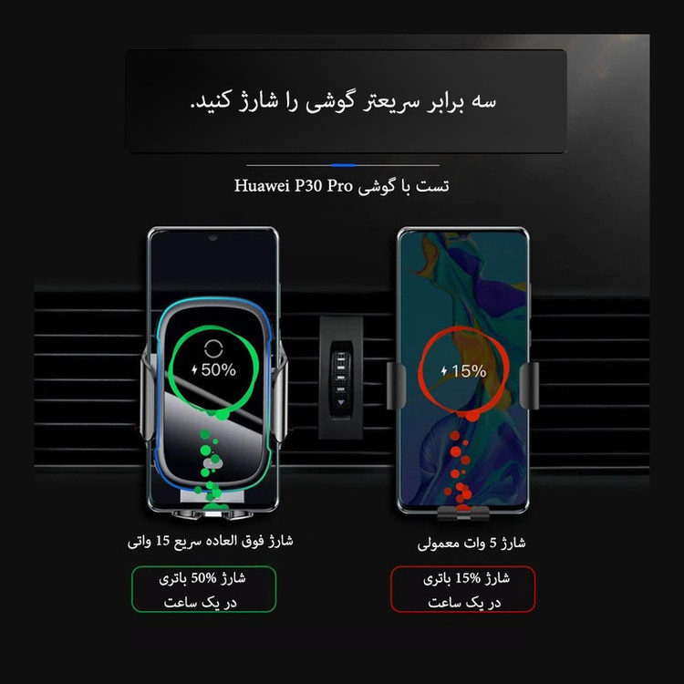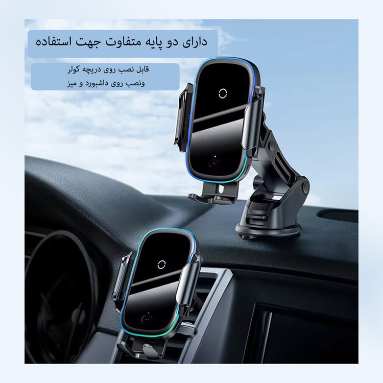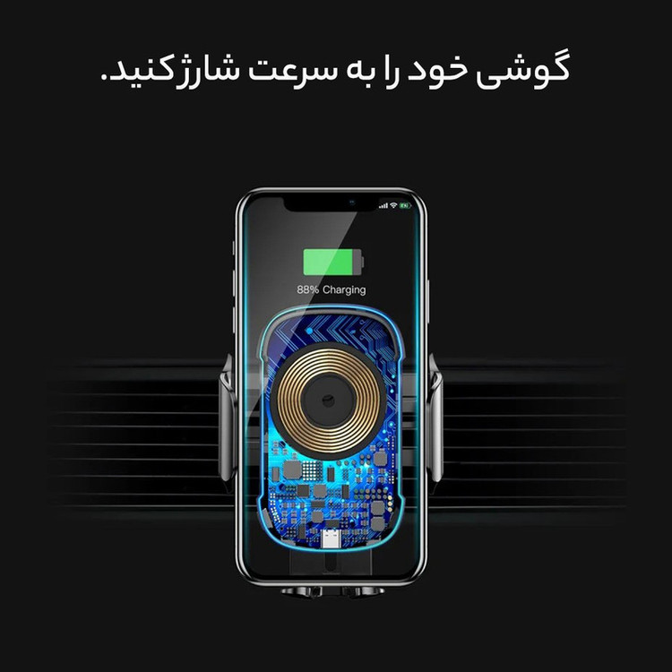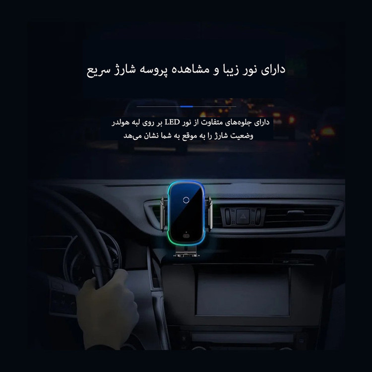قابلیت شارژ بی سیم تمامی گوشی های دارای فناوری Qi قابلیت نصب روی داشبورد و دریچه کولر چرخش 360 درجه،دارای نشانگر LED