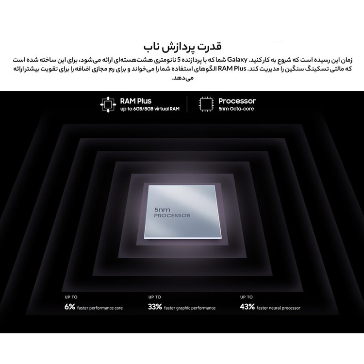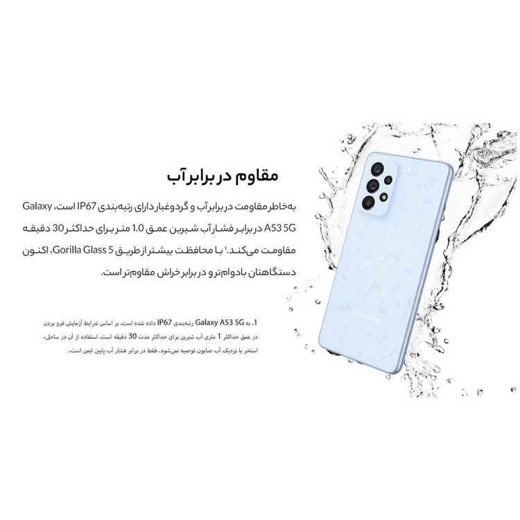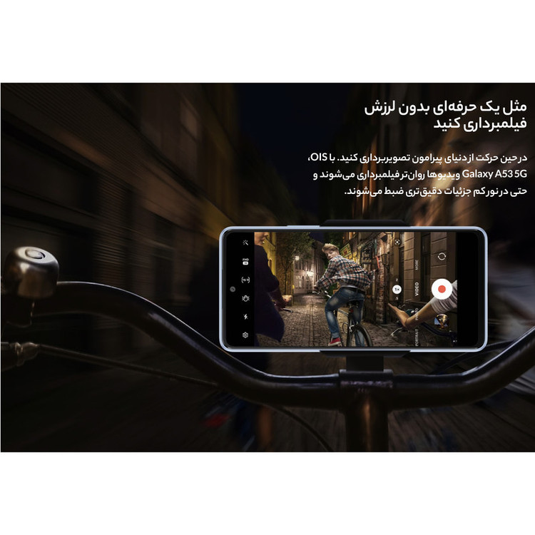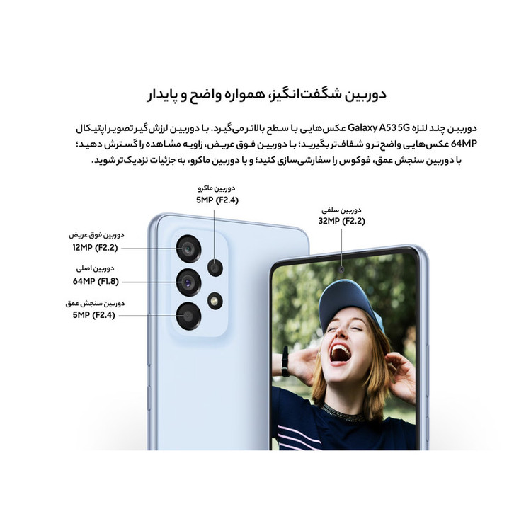 سری A گوشیهای هوشمند میانرده سامسونگ توانستهاند تا به امروز عملکرد بسیار خوب و قابل قبولی را بهنمایش بگذارند. یکی از گوشیهای میانرده و باکیفیت این شرکت، سامسونگ Galaxy A53 5G است که در جایگاه یک گوشی میانرده به مشخصات فنی قدرتمند و بسیار خوبی مجهز شده است. در نمای روبهرویی این گوشی از صفحهنمایش با ابعاد 6.46 اینچ و رزولوشن 1080×2400 پیکسل از نوع سوپر امولد بهره برده است. صفحهنمایشی که با توجه به توانایی نمایش 407 پیکسل در هر اینچ و نرخ بروزرسانی 120 هرتز، کیفیت بسیار خوبی را ارائه میکند. در قسمت پشتی هم یک سنسور دوربین اصلی با رزولوشن 64 مگاپیکسل از نوع عریض در کنار سنسور 12 مگاپیکسل از نوع فوق عریض (ultrawide) و دو سنسور با رزولوشن 5 مگاپیکسل از نوع ماکرو (برای ثبت تصاویر از فاصله نزدیک) و سنجش عمق، سنسورهای دوربین چهارگانه سامسونگ Galaxy A53 5G را تشکیل میدهند. برای دوربین سلفی هم سنسور با رزولوشن 32 مگاپیکسل در نظر گرفته شده است. حضور پردازنده قدرتمند اگزینوس 1200 اختصاصی شرکت سامسونگ هم سبب شده تا این گوشی میانرده در اجرای بازی و نرمافزارهای کاربردی، عملکرد بسیار خوب و قابل قبولی را بهنمایش بگذارد. باتری قدرتمند با میزان ظرفیت 5000 میلیآمپرساعت و پشتیبانی از فناوری شارژ سریع 25 وات هم از دیگر مشخصات در نظر گرفته شده برای سامسونگ Galaxy A53 5G هستند.
