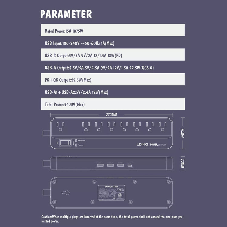 توضیحات پریز: تعداد درگاه خروجی: 8 عدد پریز، 3 پورت USB و 1 پورت USB-C