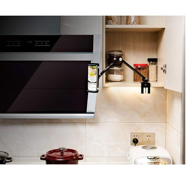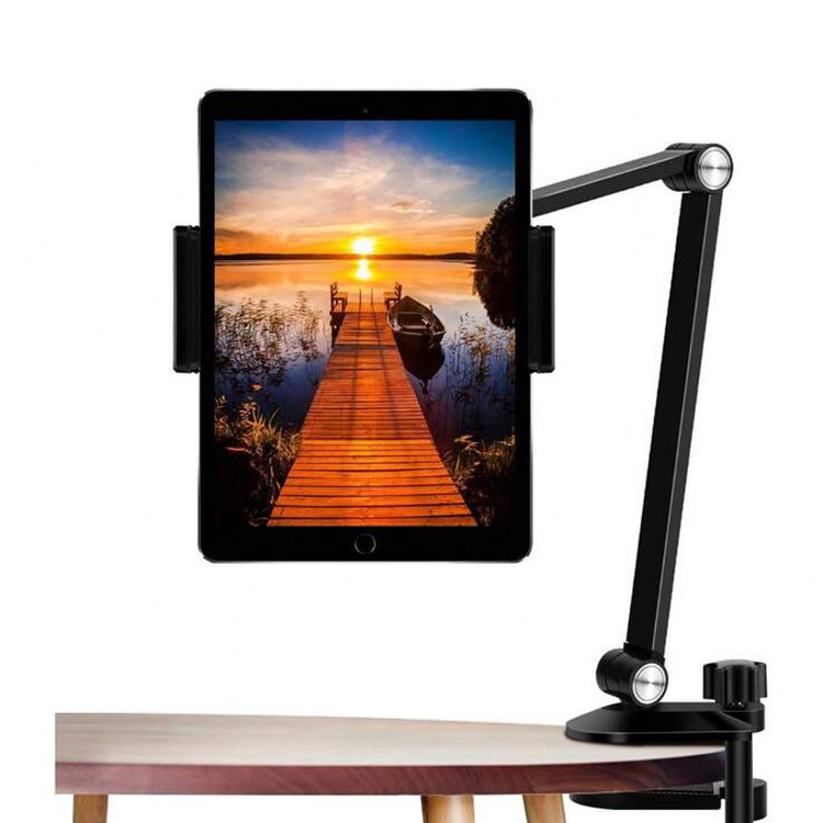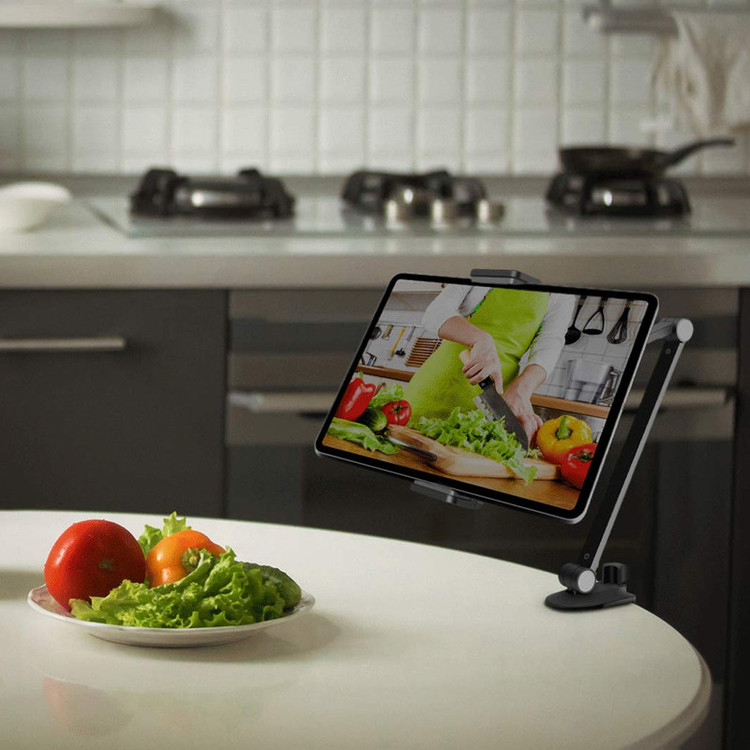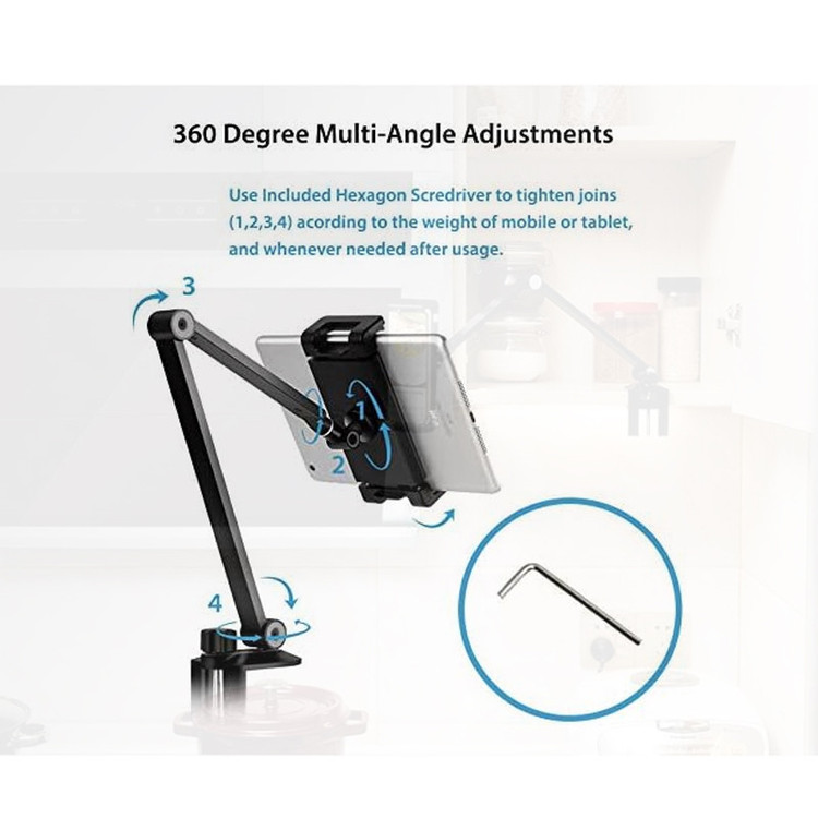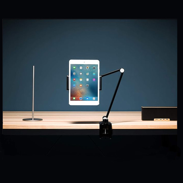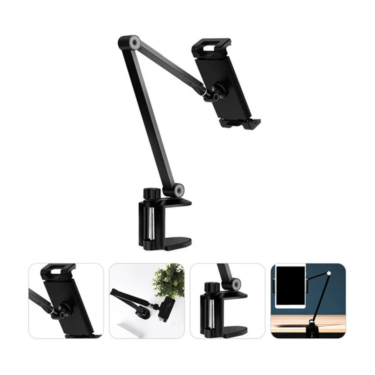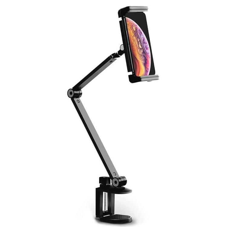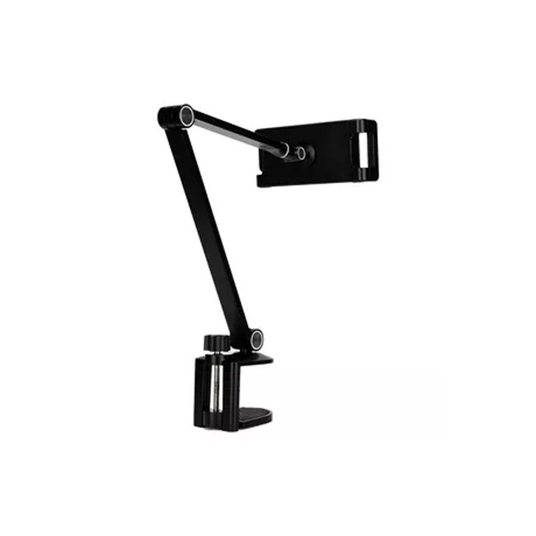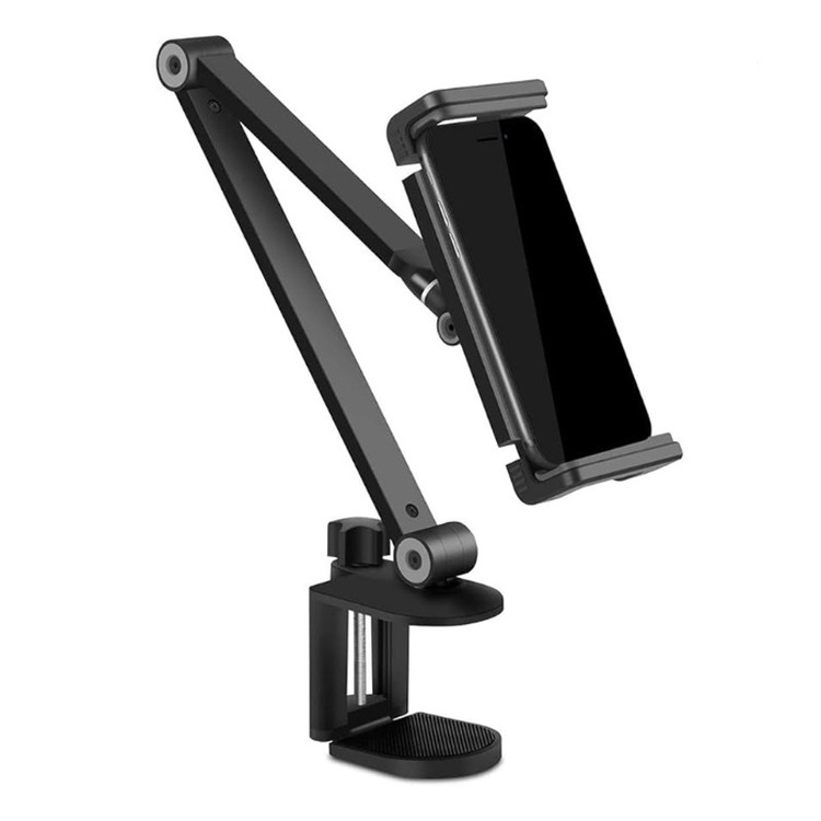 مناسب برای اکثر گوشی های هوشمند و تبلت | دارای بازوهای با قابلیت تنظیم زاویه و ارتفاع | ساخته شده از آلیاژ آلومینیوم مقاوم | مناسب تبلت و موبایل با اندازه 7 تا 12 اینچ
