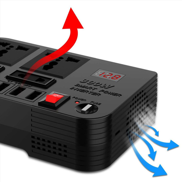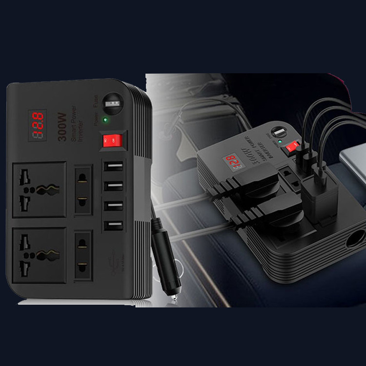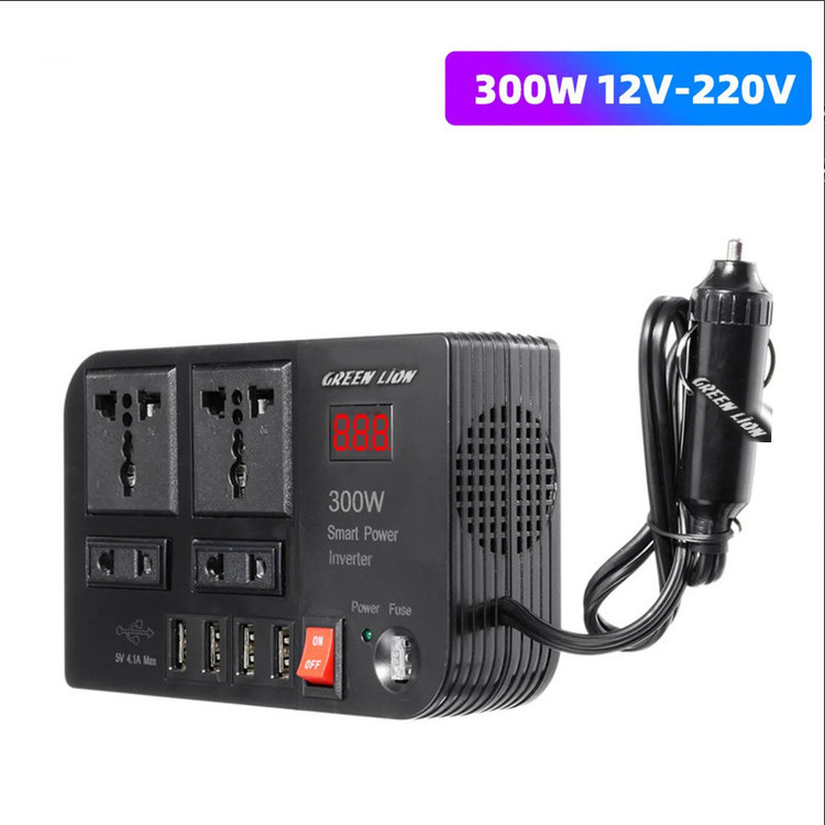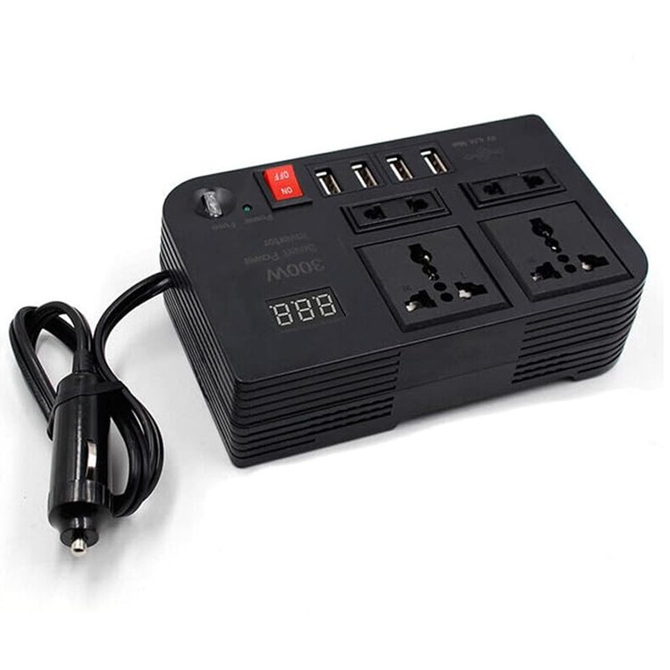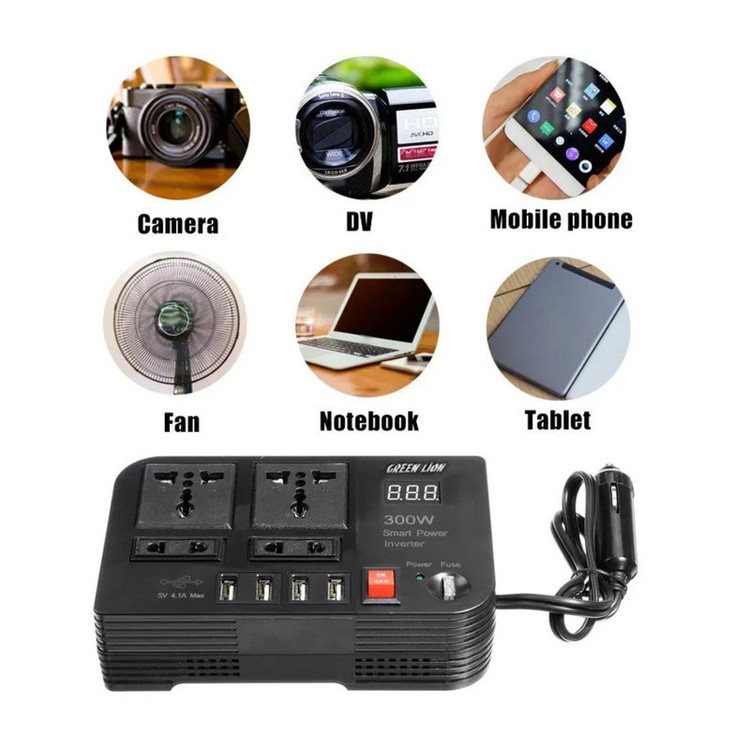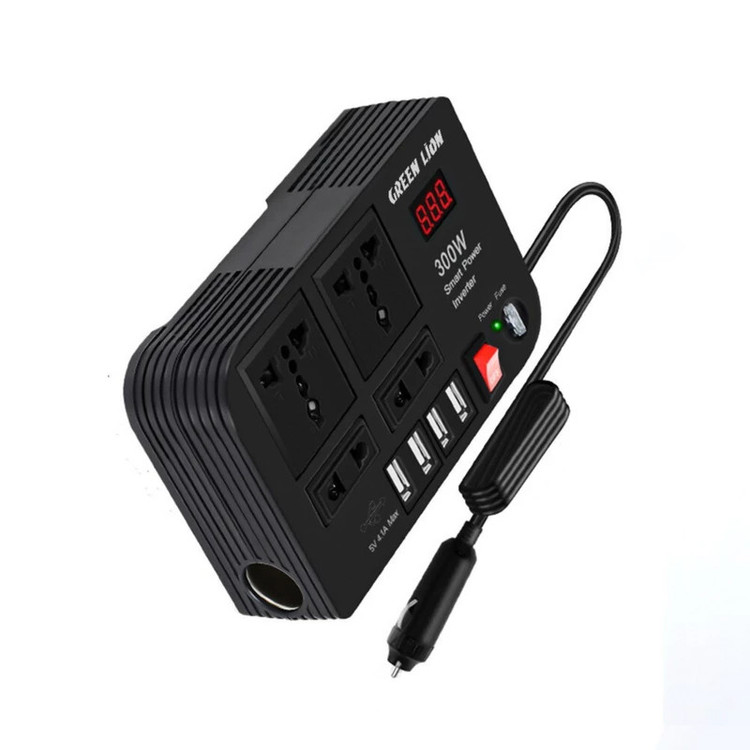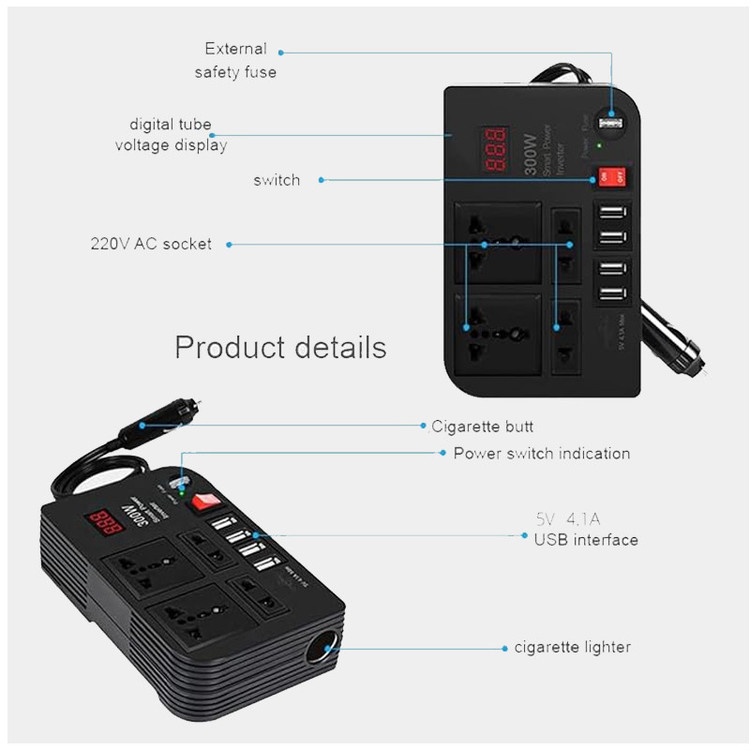 Input voltage : 12V DC | Output voltage : 220V±10% | Output Frequency : 50Hz±3Hz | USB output : 5V/4.1A Max | Max power : 300W