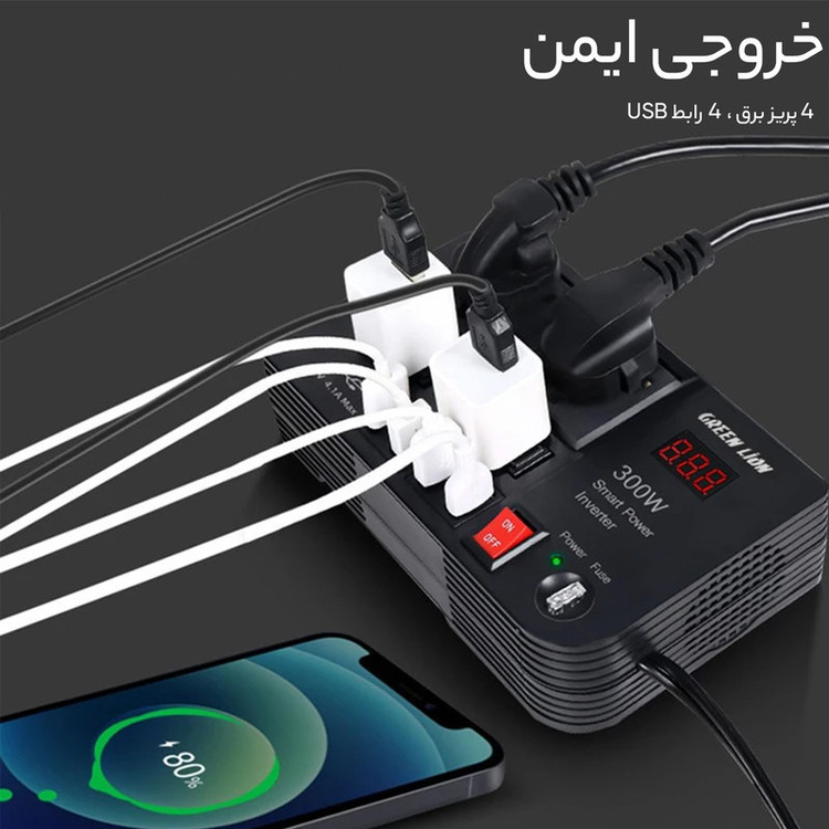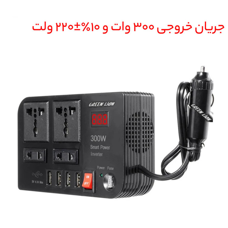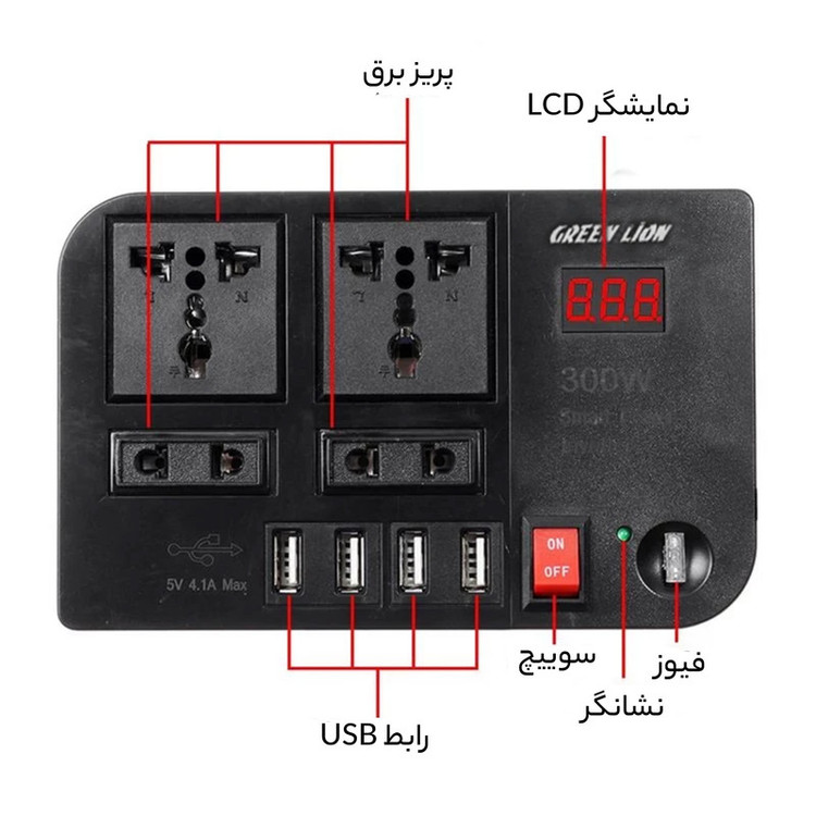 سایر توضیحات: تبدیل برق خودرو به برق 220 ولت | دارای چهار خروجی USB | دو خروجی برق CN و دو خروجی برق UK | دارای کلید قطع برق پورتهای USB