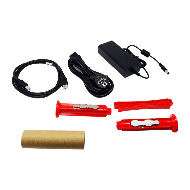 منبع تغذیه , کابل USB , دو عدد مغزی ریبون و یک عدد مغزی لیبل