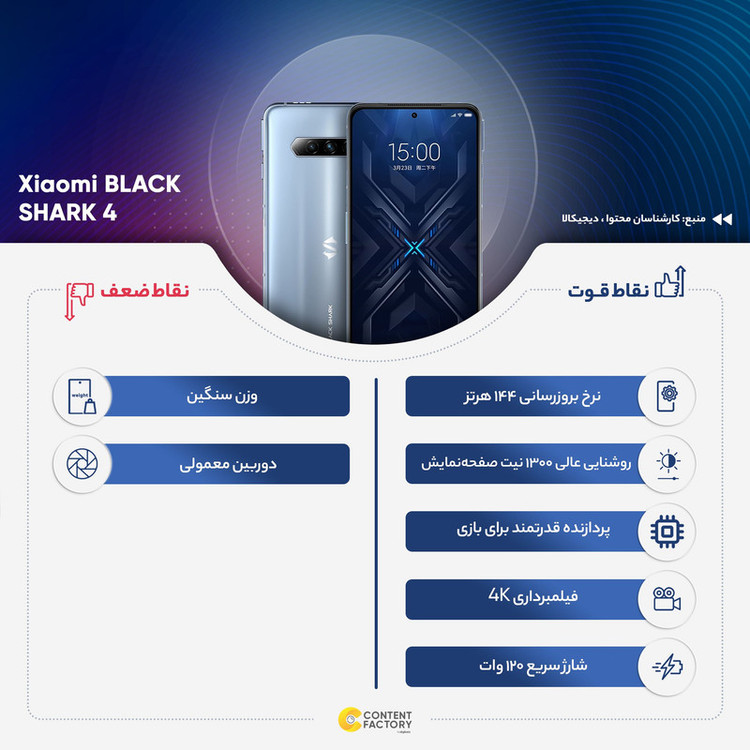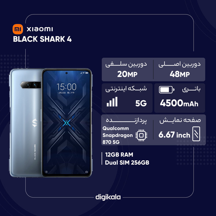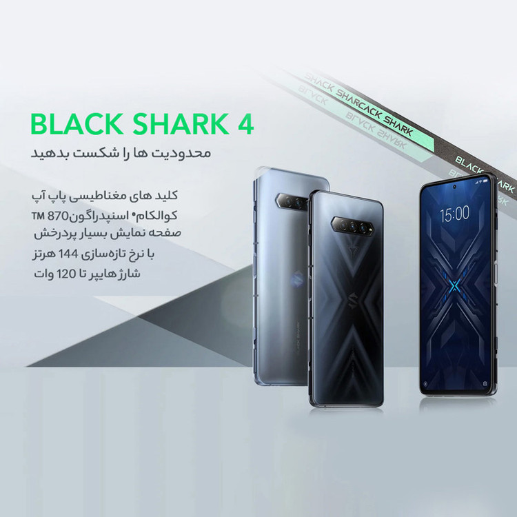 سری Black Shark گوشیهای هوشمند شرکت شیائومی با هدف استفاده برای کاربران گیمر روانه بازار شدند. یکی از گوشیهای هوشمند گیمینگ و بسیار قدرتمند این سری، BLACK SHARK 4 است که بدون هیچ تعریف اضافی باید بدانید که به مشخصات فنی مناسب و قدرتمندی مجهز شده است. در نمای روبهرویی این گوشی از صفحهنمایش با ابعاد 6.67 اینچ و رزولوشن 1080×2400 از نوع سوپرامولد مجهز شده است. نمایش 395 پیکسل در هر اینچ و البته توانایی ارائه نرخ بروزرسانی 144 هرتز، نشان دهنده آن است که با یکی از قدرتمندترین صفحاتنمایش در بین گوشیهای هوشمند روبهرو هستیم. در بخش سنسورهای دوربین پشتی هم، یک سنسور دوربین اصلی با رزولوشن 48 مگاپیکسل از نوع عریض در کنار سنسور 8 مگاپیکسل از نوع فوق عریض (ultrawide) و سنسور 5 مگاپیکسل از نوع ماکرو، سنسورهای دوربین سهگانه این گوشی هوشمند گیمینگ را تشکیل میدهند. برای دوربین سلفی هم سنسور با رزولوشن 20 مگاپیکسل در نظر گرفته شده است. در بخش مشخصات سختافزاری هم این گوشی به یکی از قدرتمندترین پردازندههای شرکت کوالکام، یعنی اسنپدراگون 870 5G مجهز شده که بهراحتی از پس اجرای سنگینترین بازیهای روز دنیا هم بر میآید. باتری 4500 میلیامپرساعت در کنار شارژٰر 67 واتی مجهز به شارژ سریع هم از دیگر مشخصات در نظر گرفته شده برای این گوشی هوشمند گیمینگ قدرتمند است.