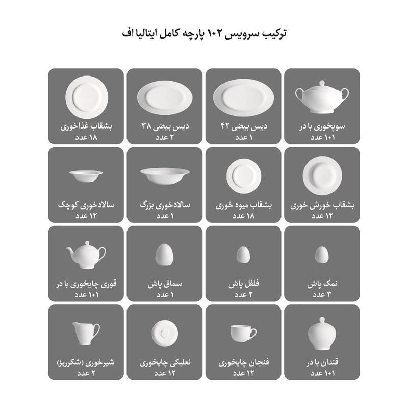 اقلام سرویس: سوپخوری , ظرف سالاد , سالادخوری , دیس , بشقاب غذاخوری , بشقاب خورشخوری , پیشدستی , قوری چایخوری , فنجان , نعلبکی , قندان , شکرریز , نمکپاش و فلفلپاش