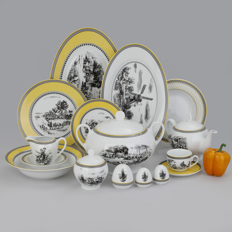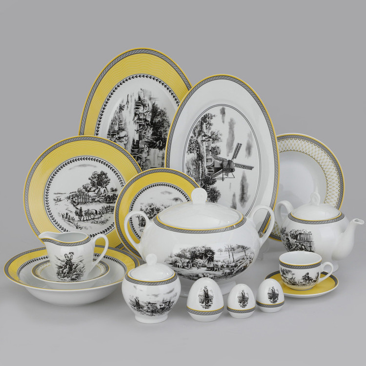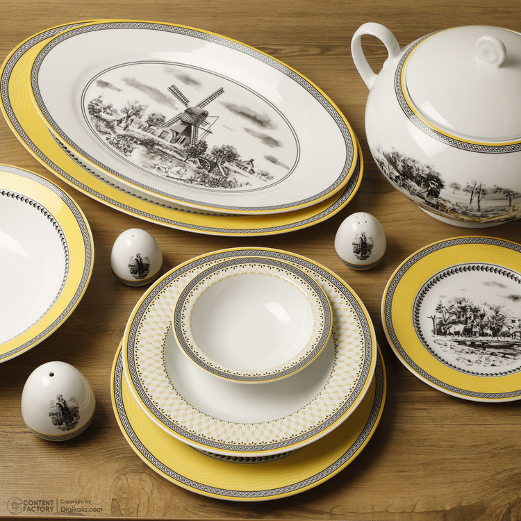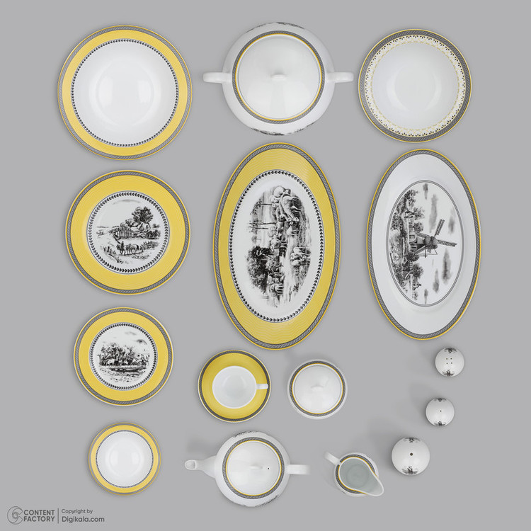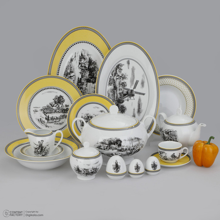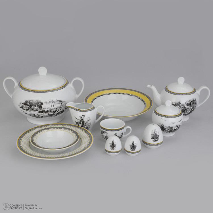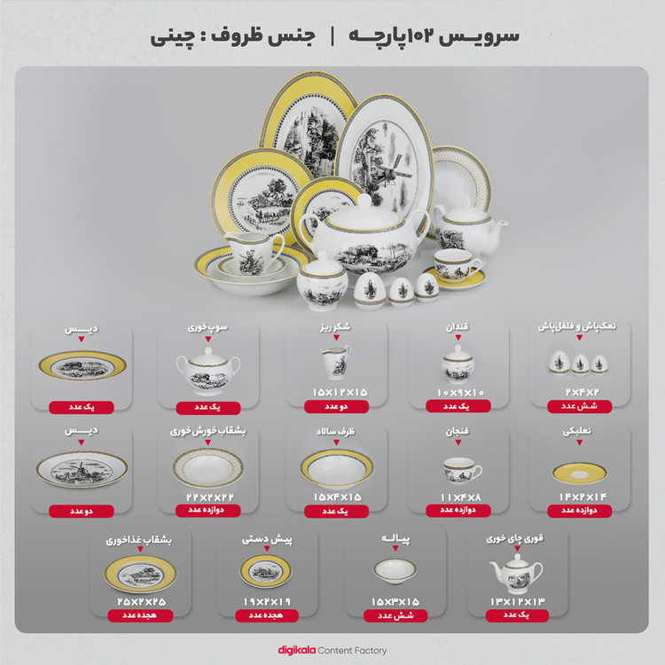 اقلام سرویس: سوپخوری , ظرف سالاد , سالادخوری , دیس , بشقاب غذاخوری , بشقاب خورشخوری , پیشدستی , قوری چایخوری , فنجان , نعلبکی , قندان , شکرریز , نمکپاش و فلفلپاش , پیاله , ظرف سس
