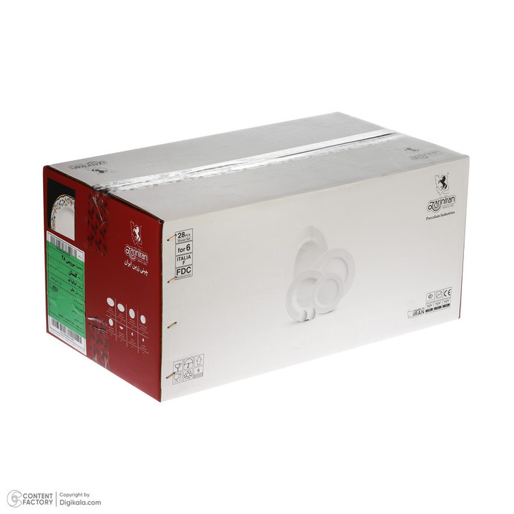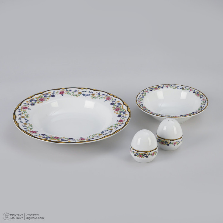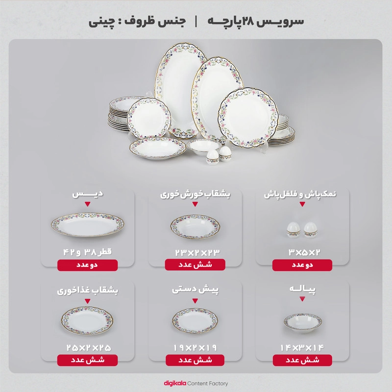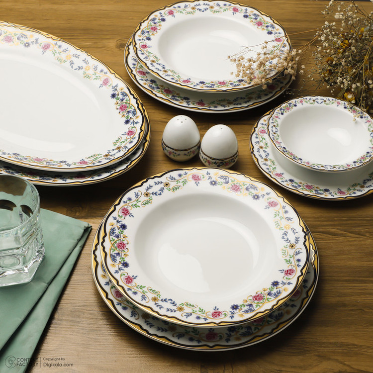 اقلام سرویس: دیس , بشقاب غذاخوری , بشقاب خورشخوری , پیشدستی , نمکپاش و فلفلپاش , پیاله
