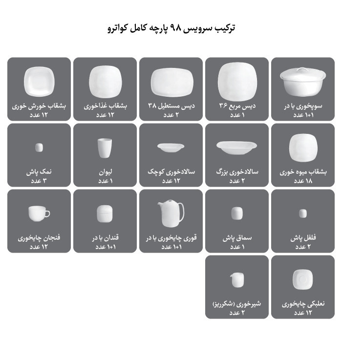 اقلام سرویس: سوپخوری , ظرف سالاد , دیس , بشقاب غذاخوری , بشقاب خورشخوری , پیشدستی , قوری چایخوری , فنجان , نعلبکی , قندان , شکرریز , نمکپاش و فلفلپاش , پیاله , لیوان