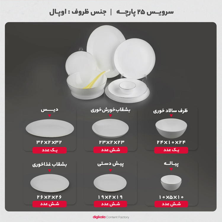 اقلام سرویس: ظرف سالاد , دیس , بشقاب غذاخوری , بشقاب خورشخوری , پیشدستی , پیاله