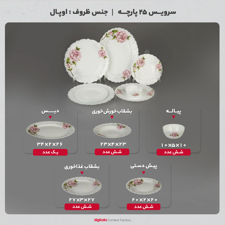 اقلام سرویس: دیس , بشقاب غذاخوری , بشقاب خورشخوری , پیشدستی , پیاله