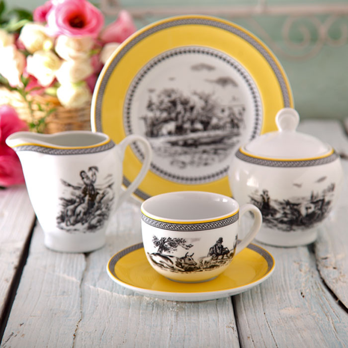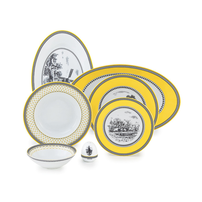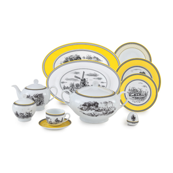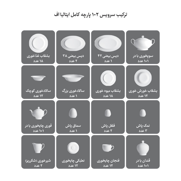 سوپخوری , سالادخوری , دیس , بشقاب غذاخوری , بشقاب خورشخوری , پیشدستی , قوری چایخوری , فنجان , نعلبکی , قندان , شکرریز , نمکپاش و فلفلپاش , پیاله