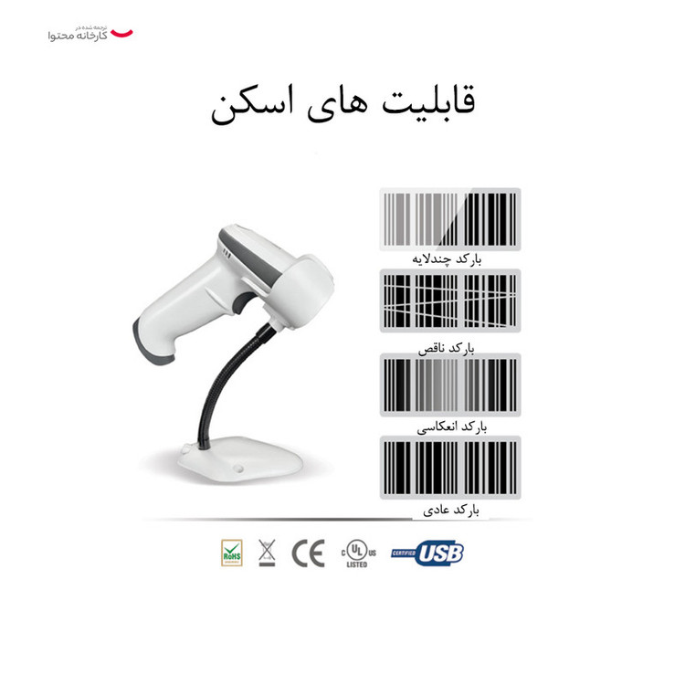نوع اتصال به دو صورت USB و Virtual COM قابليت تفكيك UID باركد دارو داراي پايه باركدخوان و كابل دو متري