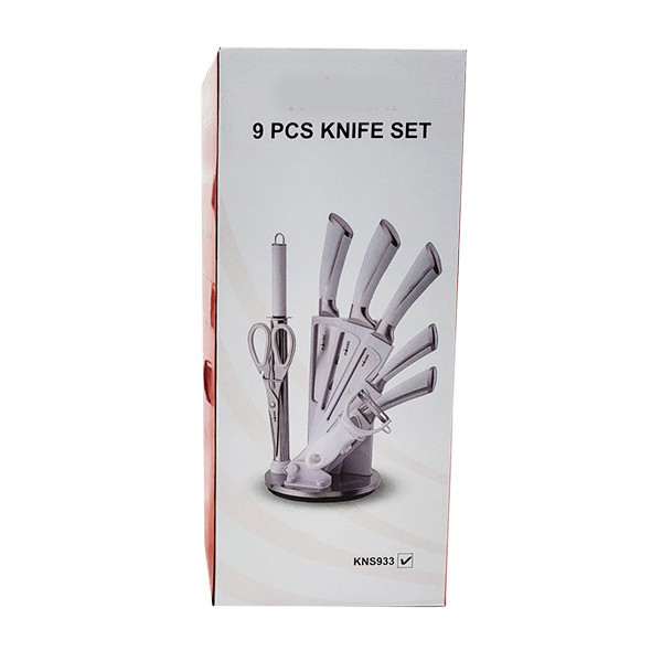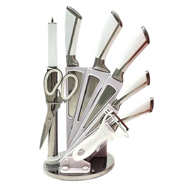 سرویس چاقو 9 پارچه رنگ دسته و استند ترکیب سفید و استیل 1 عدد ساطور 4 عدد چاقو آشپزخانه در سایز های مختلف 1 عدد چاقو تیز کن 1 عدد قیچی آشپزخانه 1 عدد پوستکن 1 عدد استند چاقو