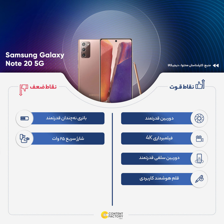 چندین سال است که گوشیهای سری Galaxy Note سامسونگ طرفداران بیشماری پیدا کردهاند و همواره این گوشیها با قابلیتهای فوقالعادهای روانهی بازار شدهاند. گوشیهای سری نوت سامسونگ، طراحی خاص خود را دارند که آنها را از گوشیهای سری S جدا میکند. همانطور که انتظار میرفت گوشی Note 20 هم از قاعده طراحی گوشیهای سری نوت پیروی کرده است. گوشی موبایل سامسونگ مدل Galaxy Note20 5G SM-N981B/DS با پشتیبانی از دو سیم کارت و ظرفیت 256 گیگابایت، از بهروزترین و باکیفیتترین گوشیهای موجود در بازار است و در کنار طراحی زیبا، از مشخصات فنی قابلتوجهای هم بهرهمند است. از ویژگیهای این گوشی موبایل میتوان به باتری لیتیوم یونی با ظرفیت 4300 میلیآمپر اشاره کرد که شما را از شارژ کردن مداوم گوشی موبایل خود بینیاز میکند. این محصول قابلیت شارژ سریع با توان 25 وات را دارد و از فناوری شارژ سریع PD نسخه سوم پشتیبانی میکند. از دیگر قابلیتهای گوشی Note 20 میتوان به برخورداری از قابلیت شارژ بیسیم Qi/PMA با توان 15 وات اشاره کرد. دوربین 64 مگاپیکسلی این موبایل آن را برای انجام عکاسی حرفهای هم به گزینهای مناسب بدل کرده است.