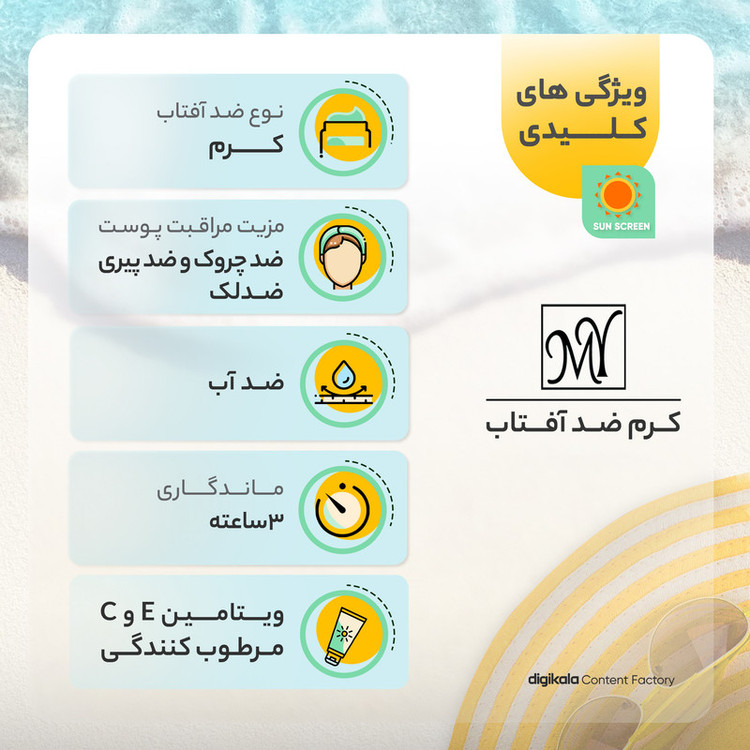 ویژگیهای ضدآفتاب : ضد آب , محافظت کننده در برابر اشعه UVA , محافظت کننده در برابر اشعه UVB , مرطوب کننده