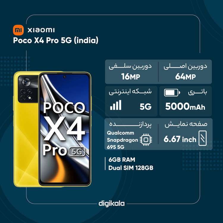 سری پوکو گوشیهای هوشمند میانرده شرکت شیائومی با توجه به قیمت در نظر گرفته شده به مشخصات فنی مناسب و کاملا قابل قبولی مجهز شدهاند و در بین کاربران محبوبیت بالایی دارند. یکی از گوشیهای میانرده و باکیفیت این سری، شیائومی Poco X4 Pro 5G است که در جایگاه یک گوشی میانرده به مشخصات فنی مناسبی مجهز شده است. لازم به ذکر است که مدل هند این گوشی به نسبت مدل گلوبال در زمینه سنسور دوربین عریض با یکدیگر متفاوت هستند و مدل هند به سنسور دوربین عریض 64 مگاپیکسل و مدل گلوبال به سنسور دوربین عریض 108 مگاپیکسل مجهز شدهاند. در نمای روبهرویی این گوشی از صفحهنمایش با ابعاد 6.67 اینچ و رزولوشن 1080×2400 پیکسل از نوع سوپر امولد بهره برده است. این صفحهنمایش با توجه به توانایی نمایش 395 پیکسل در هر اینچ و نرخ بروزرسانی 120 هرتز، عملکرد بسیار خوب و باکیفیتی را بهشما ارائه میکند. در قسمت پشتی یک سنسور دوربین اصلی قدرتمند با رزولوشن 64 مگاپیکسل از نوع عریض در کنار سنسور 8 مگاپیکسلی از نوع فوق عریض (ultrawide) و سنسور 2 مگاپیکسل ماکرو، سنسورهای دروبین سهگانه Poco X4 Pro 5G را تشکیل میدهند. برای دوربین سلفی هم سنسور با رزولوشن 16 مگاپیکسل در نظر گرفته شده است. در بخش مشخصات سختافزاری هم حضور پردازنده اسنپدراگون 695 5G شرکت کوالکام سبب شده تا این گوشی عملکرد قابل قبولی را در اجرای بازیهای حتی سنگین همانند آسفالت 9 داشته باشد. البته نباید فراموش کنیم که به لطف حضور این پردازنده، Poco X4 Pro 5G توانایی پشتیبانی از شبکههای اینترنتی پرسرعت نسل پنجم یا همان 5G را هم دارد. باتری قدرتمند با میزان ظرفیت 5000 میلیآمپرساعت در کنار شارژر 67 وات مجهز به تکنولوژی شارز سریع (توانایی شارژ صفر تا صد درصدی در مدت زمان 41 دقیقه) از دیگر مشخصات در نظر گرفته شده برای این گوشی هوشمند میانرده هستند.