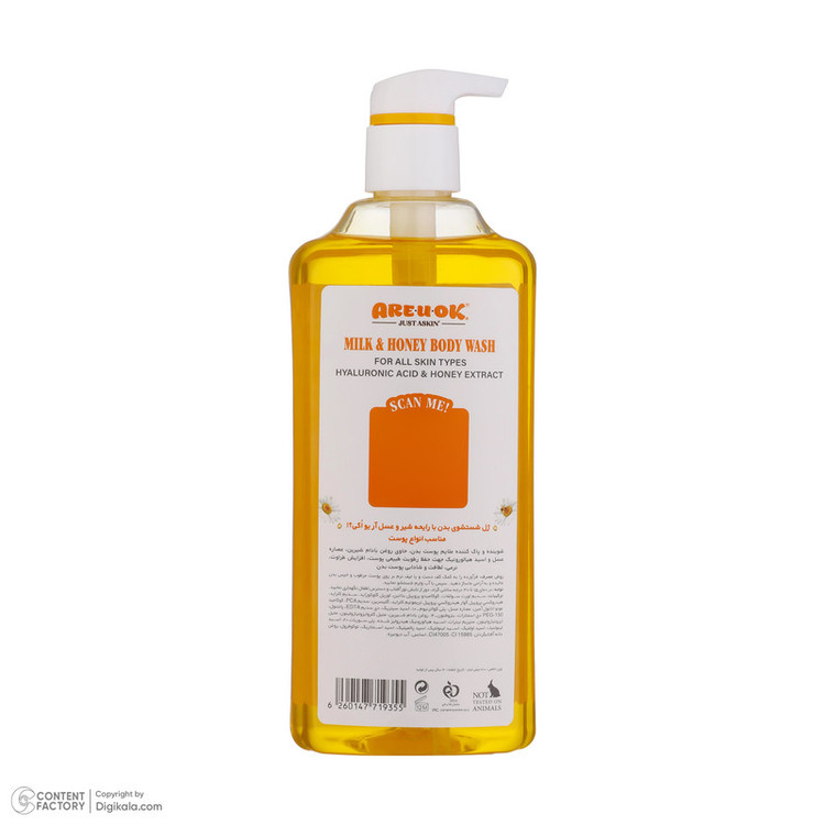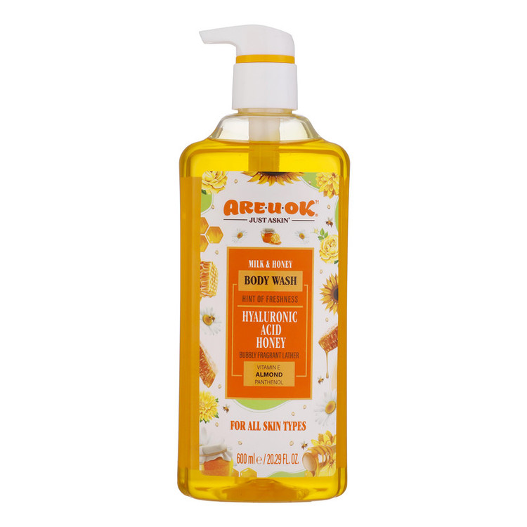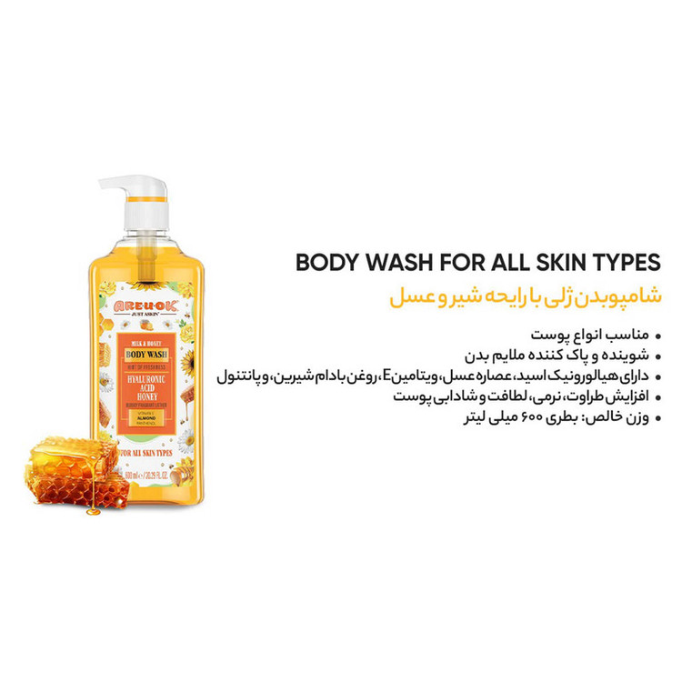 مناسب انواع پوست شوینده و پاک کننده ملایم بدن دارای هیالورونیک اسید، عصاره عسیل، ویتامین E، روغن بادام شیرین و پانتنول