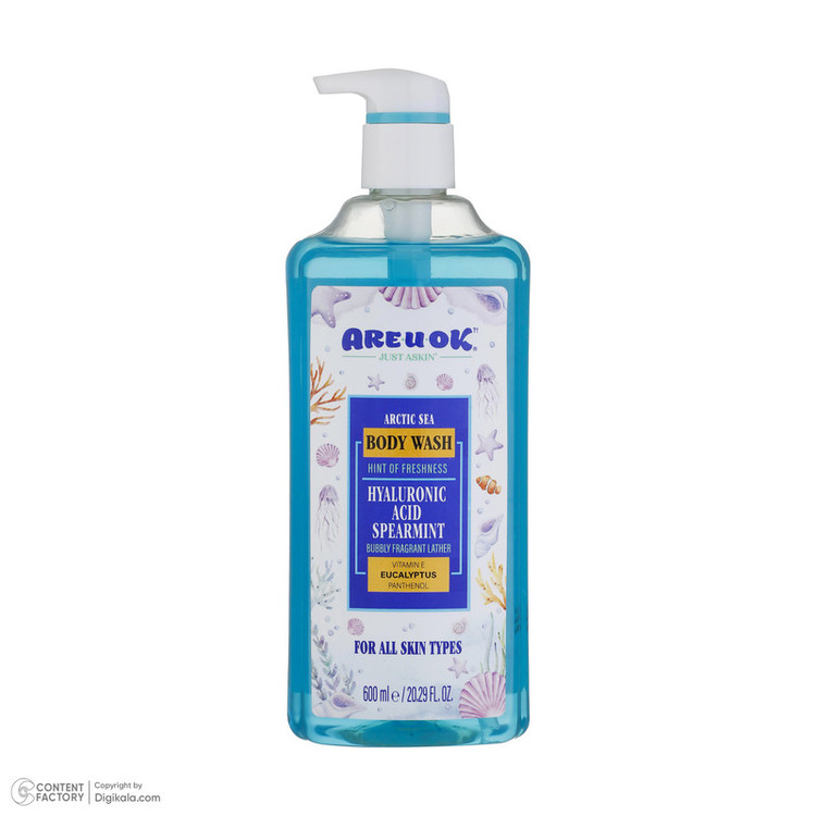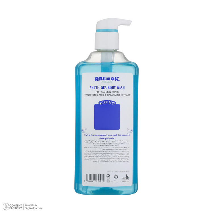 مناسب انواع پوست شوینده و پاک کننده ملایم بدن دارای هیالورونیک اسید، عصاره نعنا، اکالیپتوس، ویتامین E، پانتنول افزایش طراوت، نرمی، لطافت و شادابی پوست خنک کننده