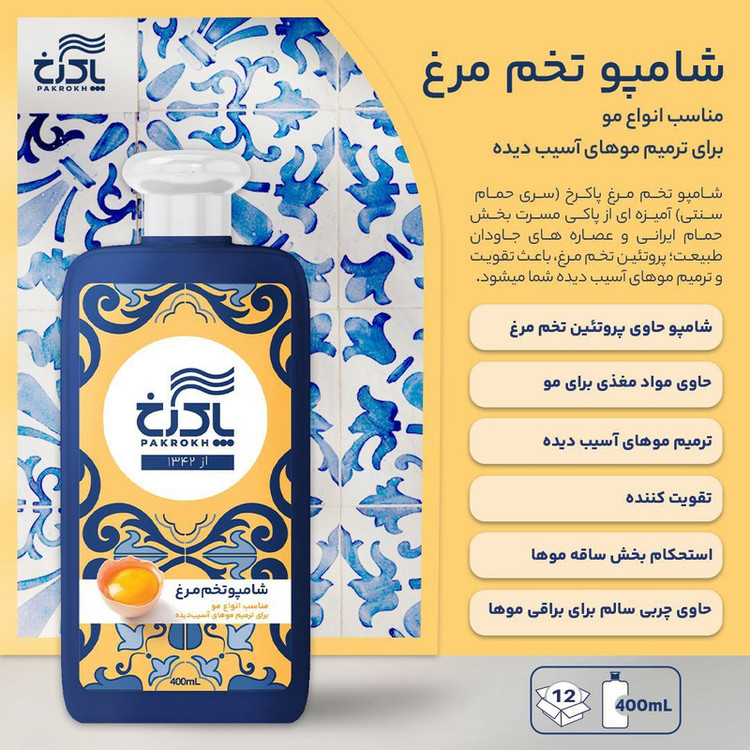 شامپو تخم مرغی پاکرخ مناسب برای انواع مو ، حاوی سدر و گلیسیرین که از خواص آن می توان به تنظیم چربی سر ، ضد التهاب ، تقویت کننده موی سر ، حالت دهنده و از رفع شوره سر اشاره کرد .