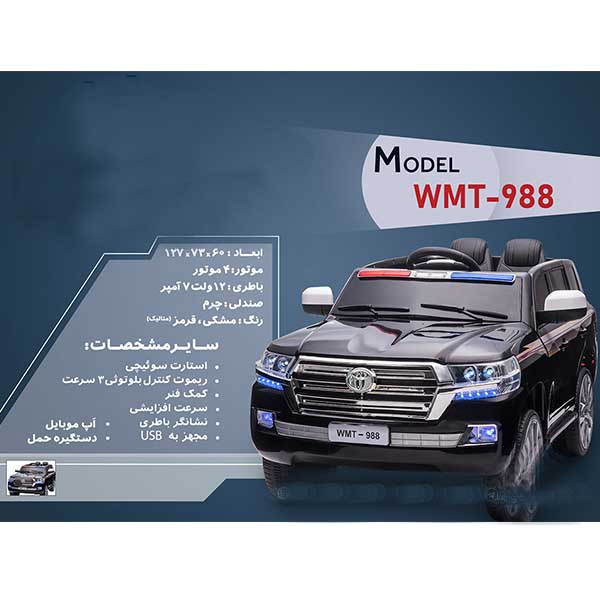 چهار موتور باتری 12.7 صندلی چرم تحمل وزن تا 65 کیلوگرم فاصله فرمان تا صندلی 47 سانتی متر دارای کمک فنر نمایشگر شارژ باطری و پخش موزیک و رادیو