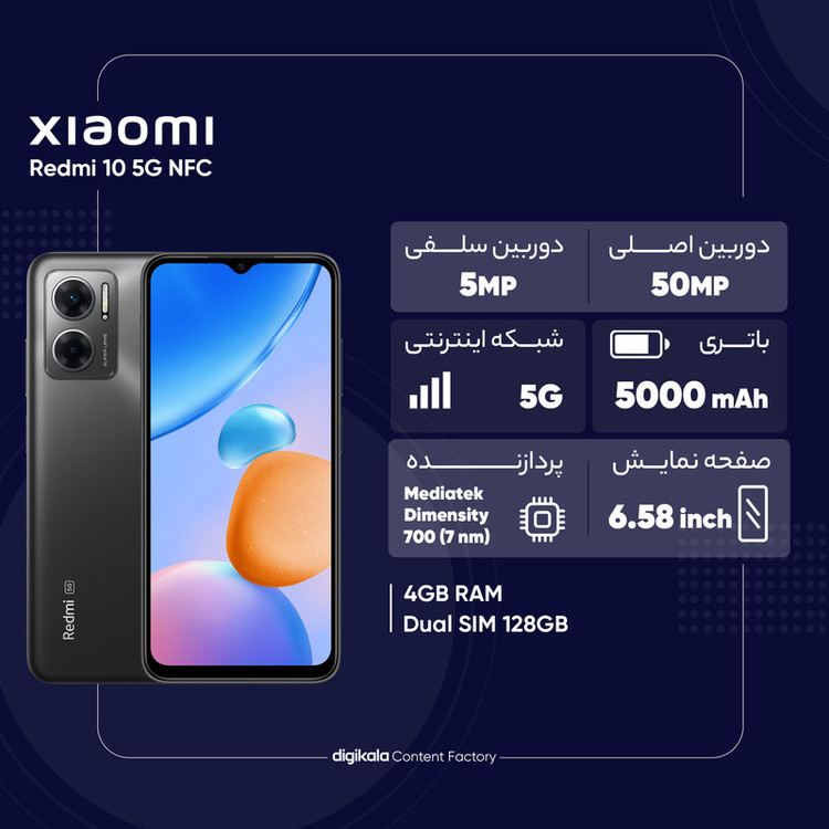 یکی از گوشیهای هوشمند میانرده و مقرون بهصرفه شرکت شیائومی که البته توانایی ارائه عملکرد بسیار خوب و قابل قبولی را دارد، Redmi 10 5G 22041219NY است. این گوشی در نمای روبهرویی به صفحهنمایش با ابعاد 6.5 اینچ و رزولوشن 1080× 2408 پیکسل از نوع IPS LCD مجهز شده است. صفحهنمایشی که با توجه به توانایی نمایش 401 پیکسل در هر اینچ و البته توانایی ارائه نرخ بروزرسانی 90 هرتز، توانایی ارائه عملکرد بسیار خوب و باکیفیتی را دارد. بریدگی دایرهای شکل ناچ در قسمت بالایی و مرکزی صفحهنمایش هم سنسور دروبین سلفی با رزولوشن 5 مگاپیکسل را در خود جای داده است. در نمای پشتی هم یک سنسور دروبین اصلی با رزولوشن 50 مگاپیکسل و گشودگی دریچه دیافراگم f/1.8 از نوع عریض در کنار سنسور با رزولوشن 2 مگاپیکسل از نوع سنجش عمق، سنسورهای دوربین دوگانه Redmi 10 5G 22041219NY را تشکیل میدهند. دوربین سلفی و دوربین اصلی این گوشی هوشمند میانرده هم در بخش فیلمبرداری، توانایی ضبط ویدیو با حداکثر کیفیت 1080pو سرعت 30 فریم در ثانیه را دارند. در بخش مشخصات سختافزاری اما این گوشی هوشمند به یکی از قدرتمندترین پردازندههای شرکت مدیاتک، یعنی دیمنسیتی 700 5G با معماری 7 نانومتری مجهز شده است. پردازندهای که در کنار عملکرد قابل قبول در اجرای بازیهای حتی سنگین، توانایی پشتیبانی از شبکههای اینترنتی نسل پنجم یا همان 5G را هم دارد. حضور باتری قدرتمند با میزان ظرفیت 5000 میلیآمپرساعت هم سبب شده تا به ازای هر بار شارژ صد درصدی، شاهد طول عمر مفید (زمان آماده بهکار) دو روز در شرایط استفاده معمولی باشید. البته لازم به ذکر است که این محصول، پک و رام گلوبال (جهانی) است.