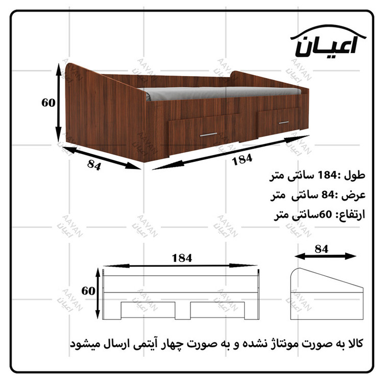 جنس مغزی نئوپان با روکش ملامینه شرکتی. دارای دو عدد کشوی چرخدار کفی تخت دو تکه از جنس نئوپان خام است. کالا فاقد تشک می باشد. کالا به صورت مونتاژ نشده و بسته بندی به صورت چهار آیتمی است.