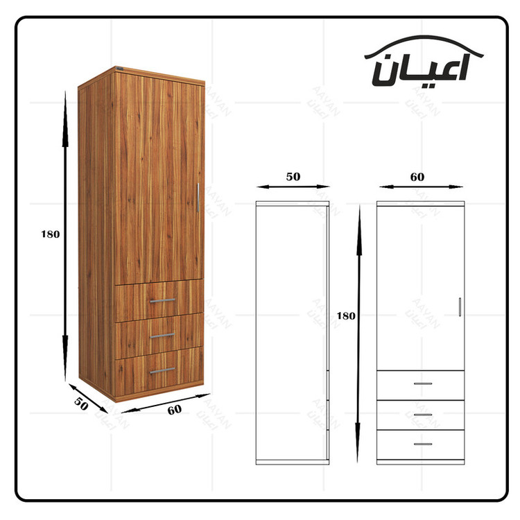 جنس ملامینه. وزن متناسب با ابعاد. نوار پی وی سی. بسته بندی با لوگو و برند اعیان. لولا آرام بند. ریل سه تکه.