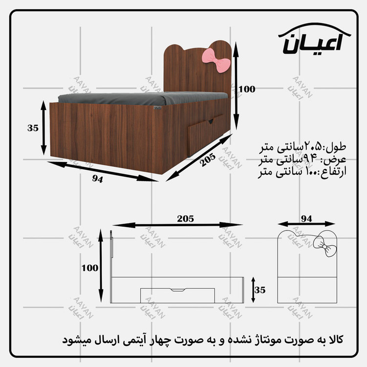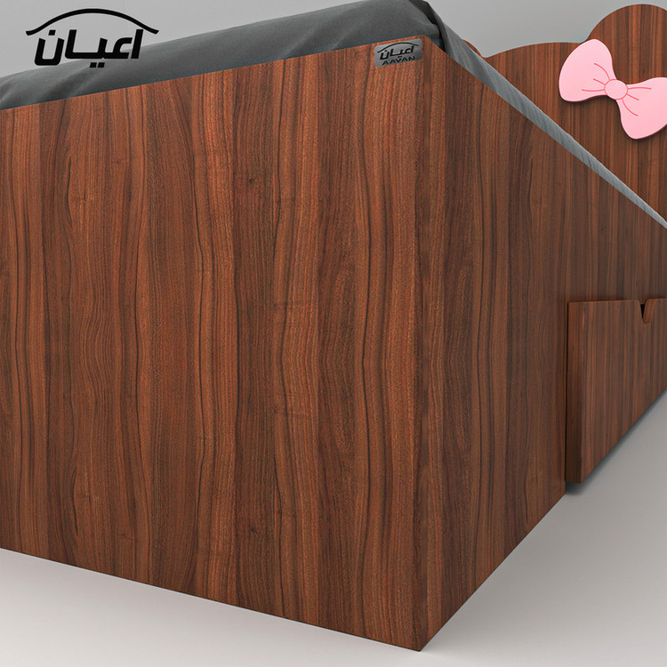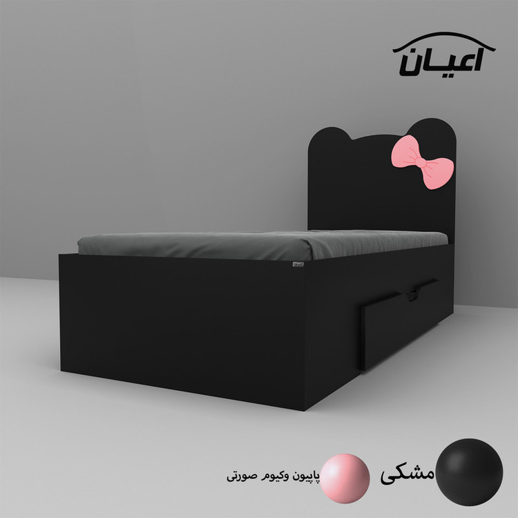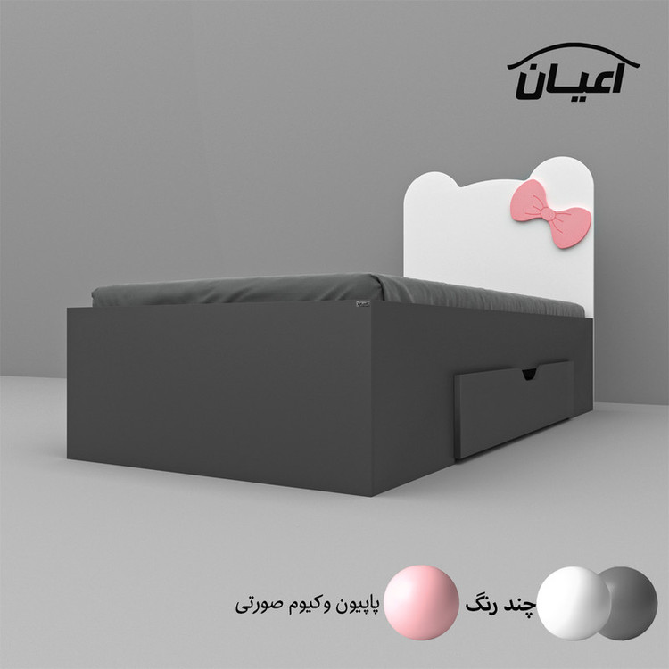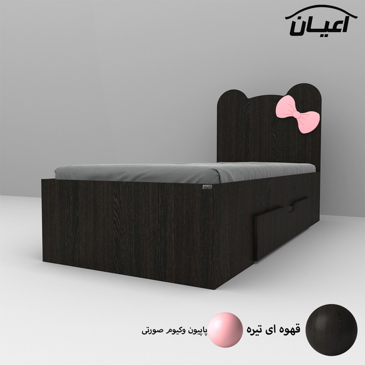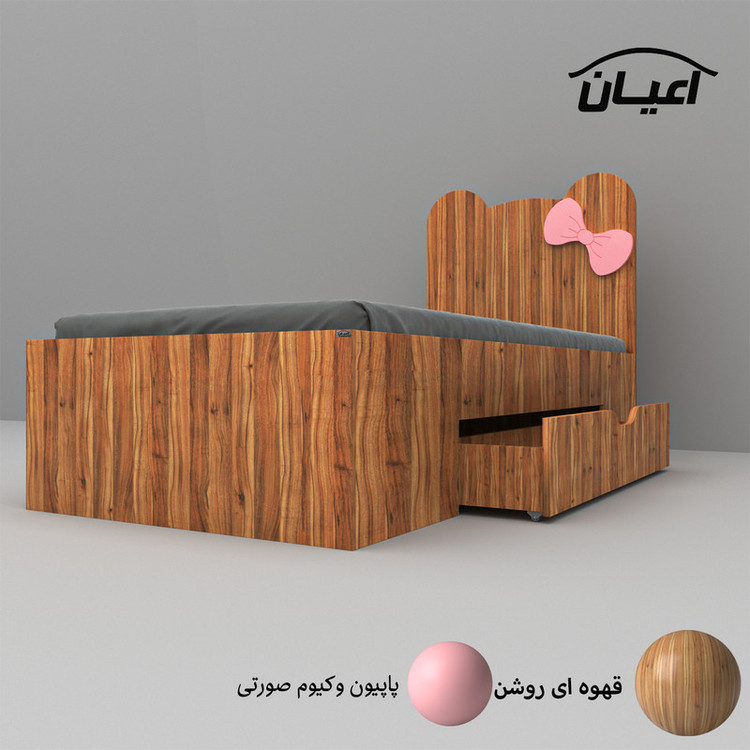 جنس مغزی نئوپان با روکش ملامینه شرکتی-پاپیون وکیوم صورتی. دارای یک عدد کشوی چرخدار کفی تخت دو تکه از جنس نئوپان خام است. کالا فاقد تشک می باشد. کالا به صورت مونتاژ نشده و بسته بندی به صورت چهار آیتمی است.