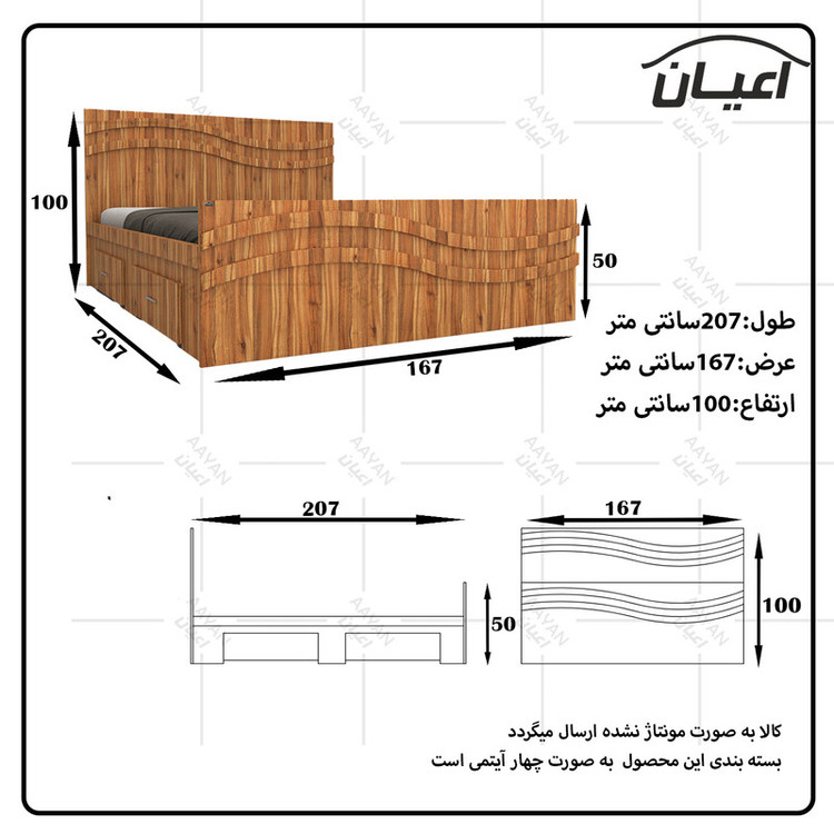 جنس نئوپان ملامینه کشوها به صورت چرخدار کفی تخت سه تکه از جنس نئوپان است. کالا فاقد تشک می باشد بسته بندی به صورت چهار آیتمی است.