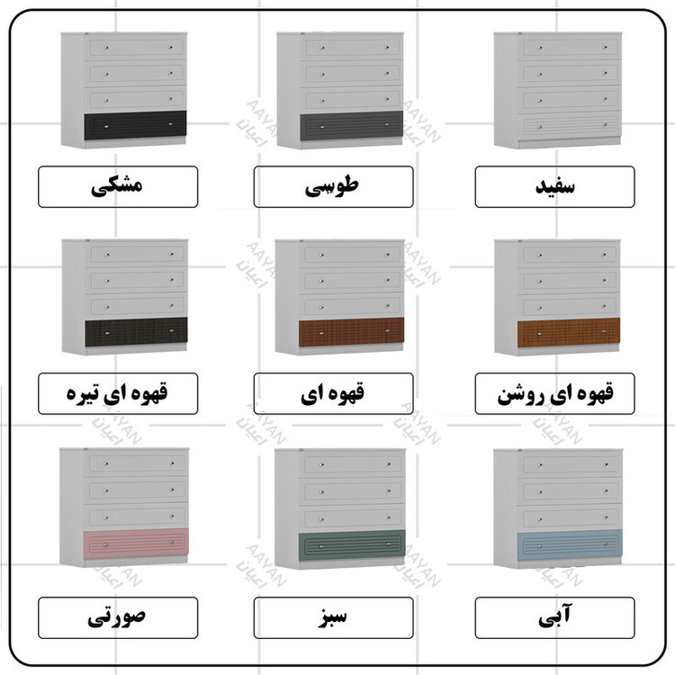 لطفا توجه فرمایید که در تمامی رنگ ها بدنه ی کالا سفید و تنها درب آخر کشو رنگی می باشد.