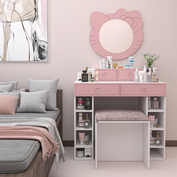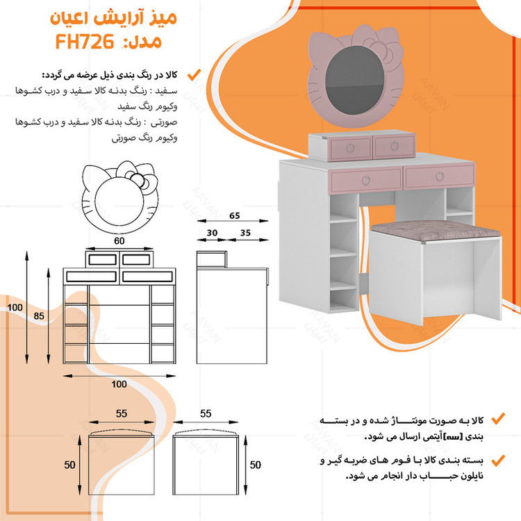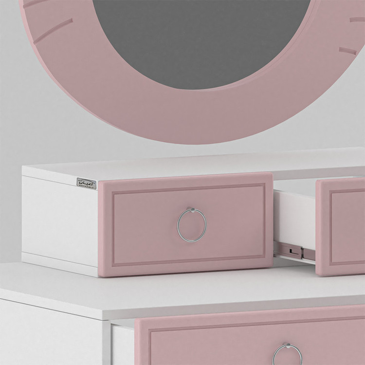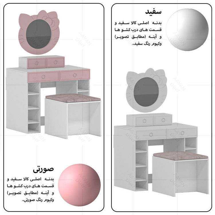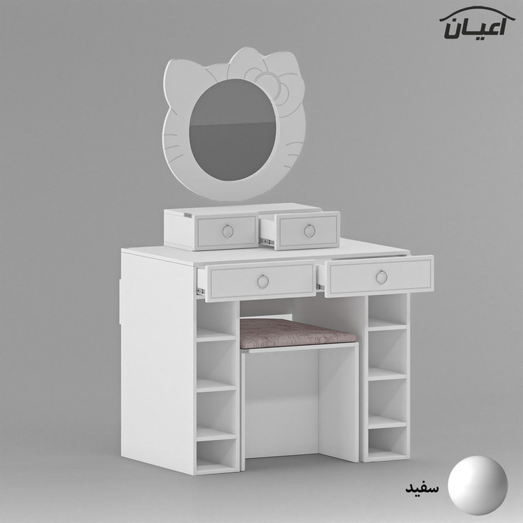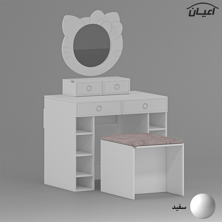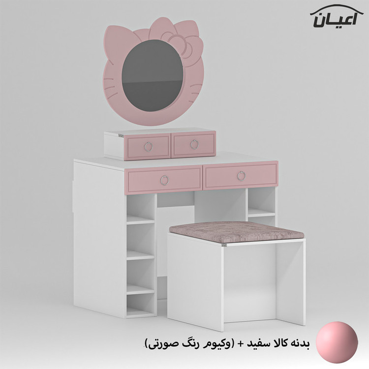 سایر توضیحات: جنس بدنه مغزی نئوپان با روکش ملامینه جنس درب ها مغزی ام دی اف با روکش وکیوم. صندلی نئوپان ملامینه دارای نشیمن لمسه با پارچه مبلی صورتی. قاب آینه مغزی ام دی اف با روکش وکیوم. ریل سه تکه. دستگیره گوشواره ای استیل.