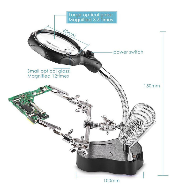 دارای ذره بین 12x (کوچک) و 3.5x (اصلی) مجهز به LED تغذیه با باتری(بدون باتری همراه) به ابعاد تقریبی کالا در البوم عکس ها مراجعه نمایید