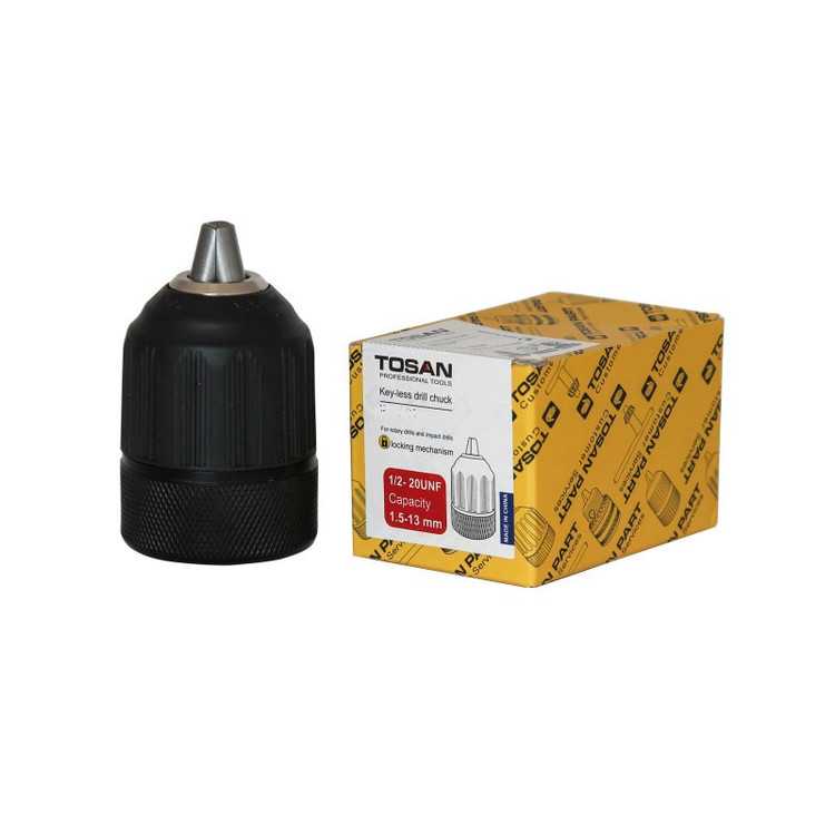 سایر توضیحات: سه نظام اتوماتیک Tosan ساخت کشور چین / ظرفیت کارگیر برابر 13 میلی متر مناسب برای مته های 1.5 - 13 میلی متر / قطر سه نظام برابر 43 میلی متر / دارای رزوه شفت 1/2 اینچ یا UNF20 / قابل استفاده برای دریل های چرخشی و ضربه ای / دارای کیفیت ساخت و کاربردی عالی