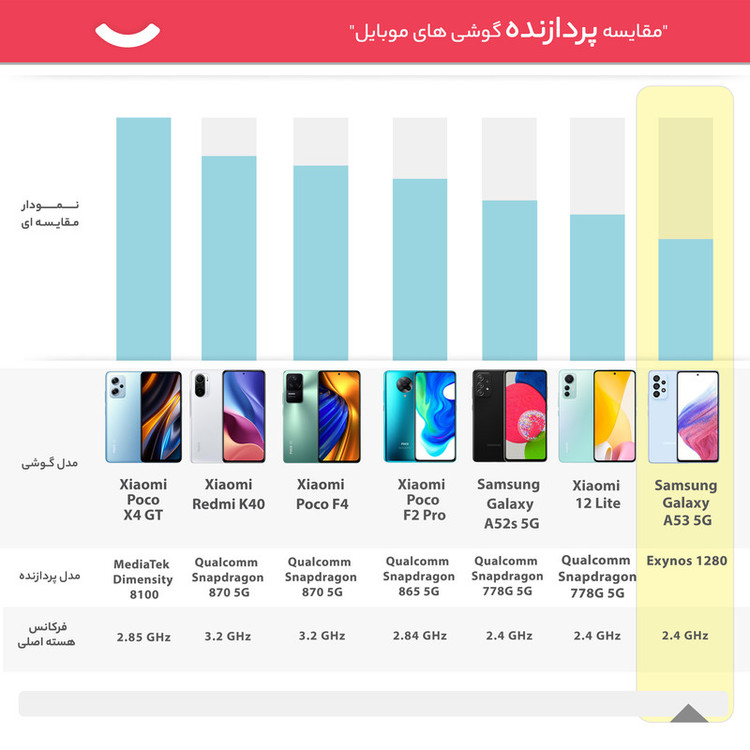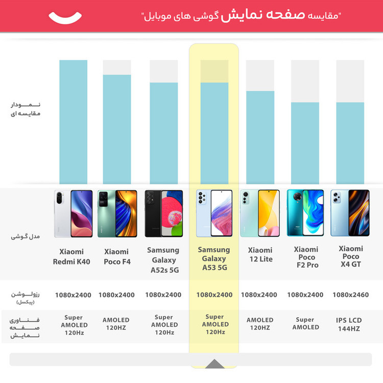 سری A گوشیهای هوشمند میانرده سامسونگ توانستهاند تا به امروز عملکرد بسیار خوب و قابل قبولی را بهنمایش بگذارند. یکی از گوشیهای میانرده و باکیفیت این شرکت، سامسونگ Galaxy A53 5G است که در جایگاه یک گوشی میانرده به مشخصات فنی قدرتمند و بسیار خوبی مجهز شده است. در نمای روبهرویی این گوشی از صفحهنمایش با ابعاد 6.46 اینچ و رزولوشن 1080×2400 پیکسل از نوع سوپر امولد بهره برده است. صفحهنمایشی که با توجه به توانایی نمایش 407 پیکسل در هر اینچ و نرخ بروزرسانی 120 هرتز، کیفیت بسیار خوبی را ارائه میکند. در قسمت پشتی هم یک سنسور دوربین اصلی با رزولوشن 64 مگاپیکسل از نوع عریض در کنار سنسور 12 مگاپیکسل از نوع فوق عریض (ultrawide) و دو سنسور با رزولوشن 5 مگاپیکسل از نوع ماکرو (برای ثبت تصاویر از فاصله نزدیک) و سنجش عمق، سنسورهای دوربین چهارگانه سامسونگ Galaxy A53 5G را تشکیل میدهند. برای دوربین سلفی هم سنسور با رزولوشن 32 مگاپیکسل در نظر گرفته شده است. حضور پردازنده قدرتمند اگزینوس 1200 اختصاصی شرکت سامسونگ هم سبب شده تا این گوشی میانرده در اجرای بازی و نرمافزارهای کاربردی، عملکرد بسیار خوب و قابل قبولی را بهنمایش بگذارد. باتری قدرتمند با میزان ظرفیت 5000 میلیآمپرساعت و شارژر با توان 25 وات مجهز به تکنولوژی شارژ سریع هم از دیگر مشخصات در نظر گرفته شده برای سامسونگ Galaxy A53 5G هستند. همانطور که میدانید درون جعبه این گوشی خبری از آداپتور شارژر نیست. اما این گوشی بههمراه شارژر 25 وات سامسونگ به فروش میرسد.