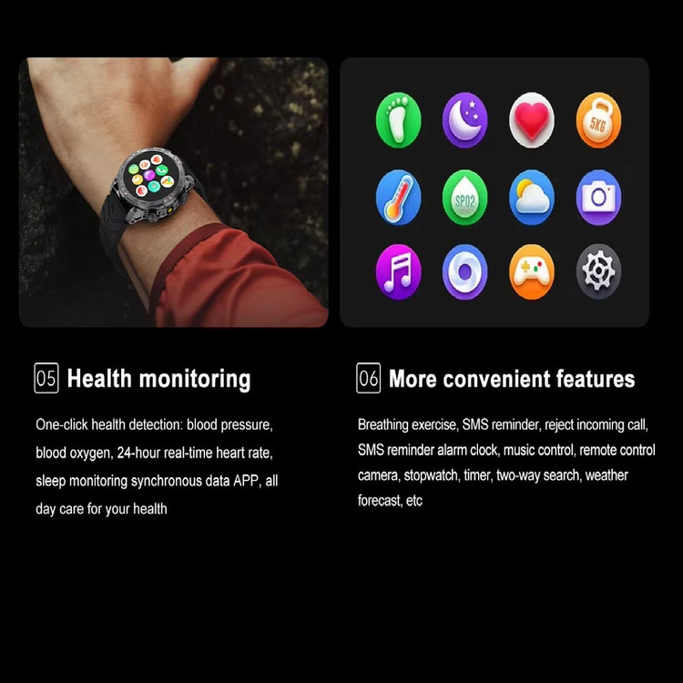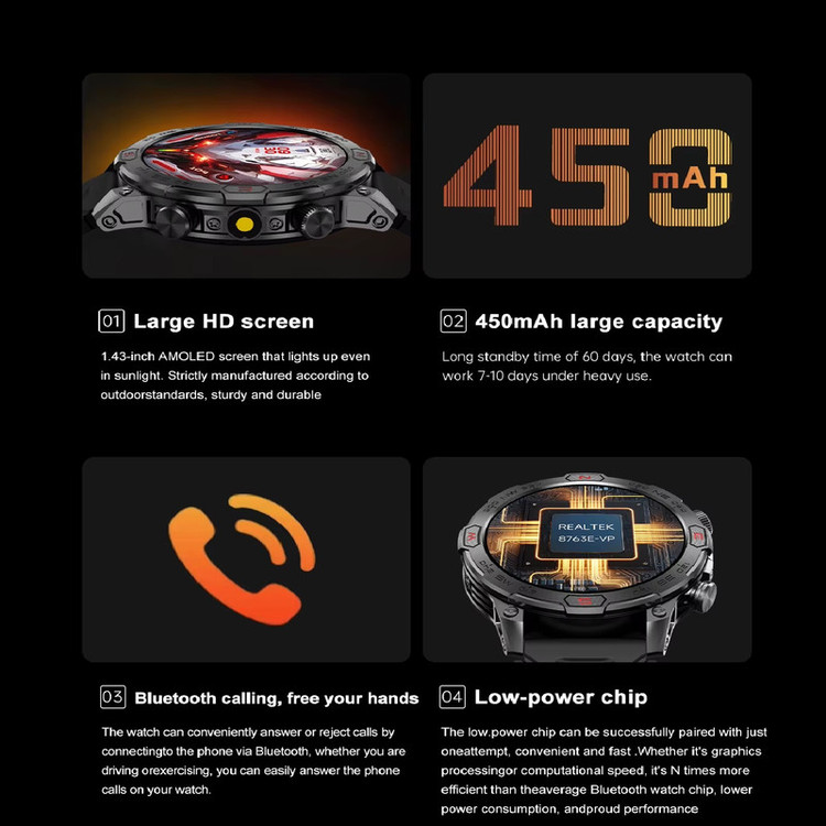 قابلیتهای ساعت هوشمند : صفحه نمایش لمسی , کنترل موسیقی (Music Player) , کنترل سطح اکسیژن خون , قابلیت مکالمه از طریق بلوتوث , قابلیت تغییر طرح ساعت یا تم