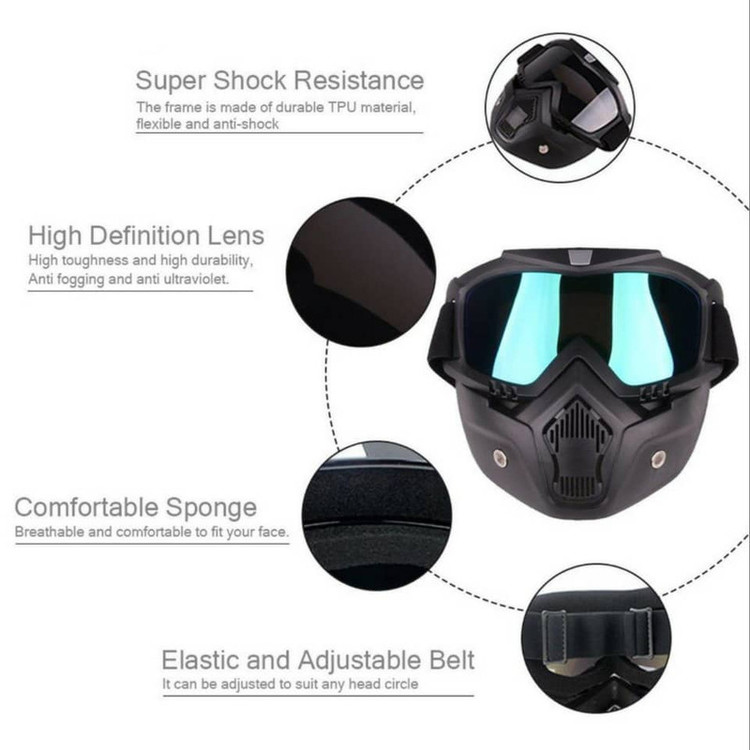 عینک هفت رنگ است قسمت عینک از قسمت ماسک جدا میشود و عینک قابلیت استفاده جداگانه دارد مناسب برای موتور سواری ، اسکی و اسکیت است