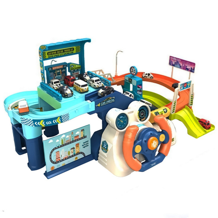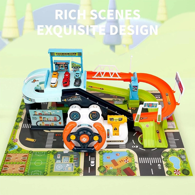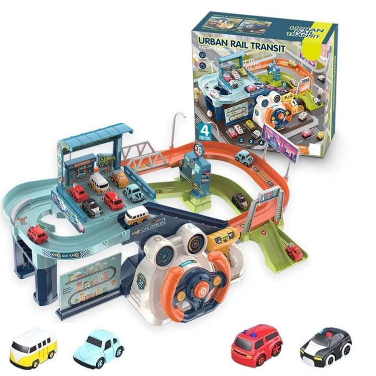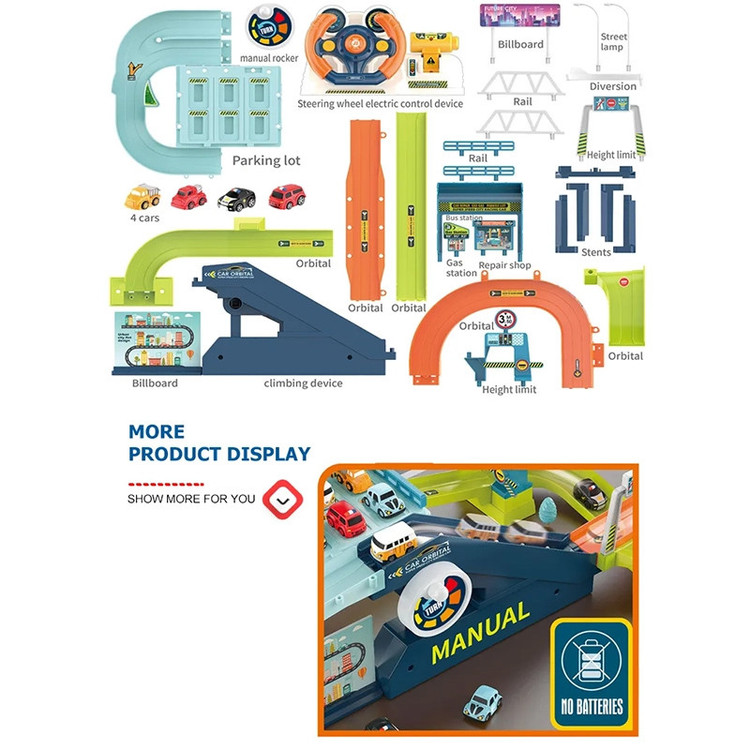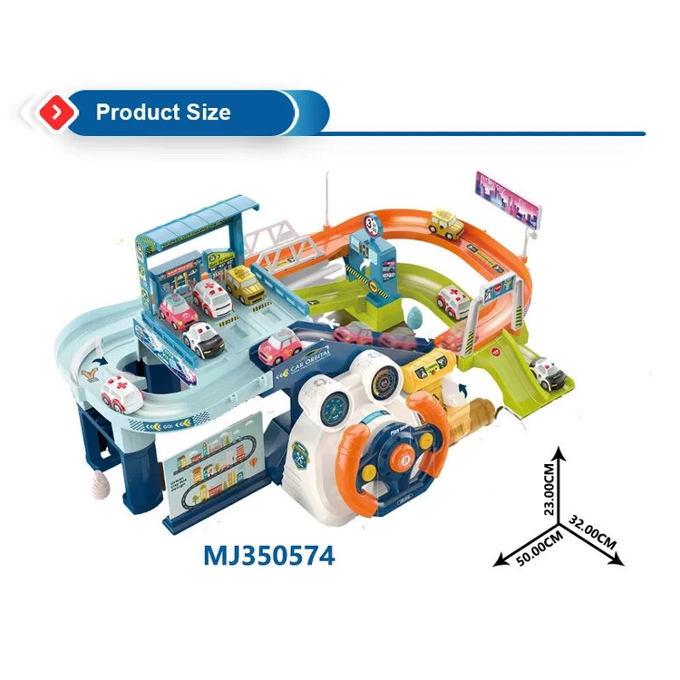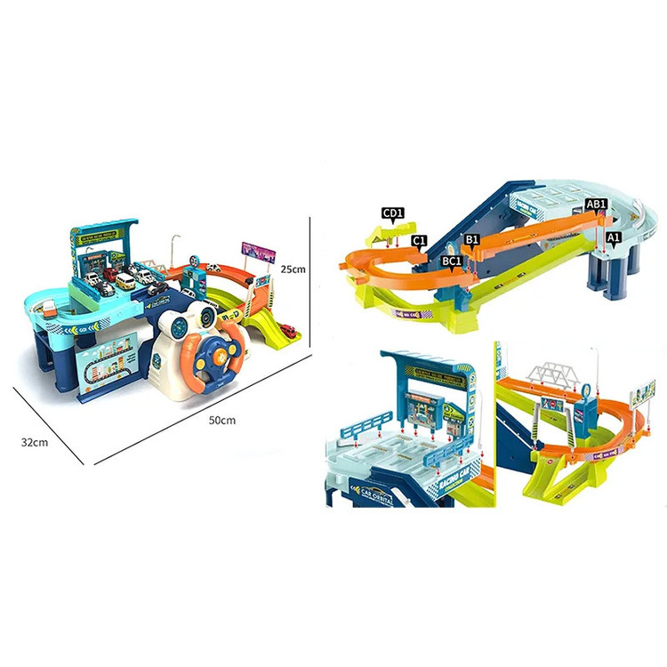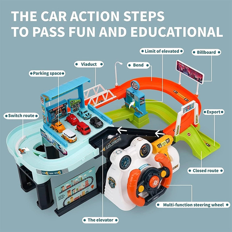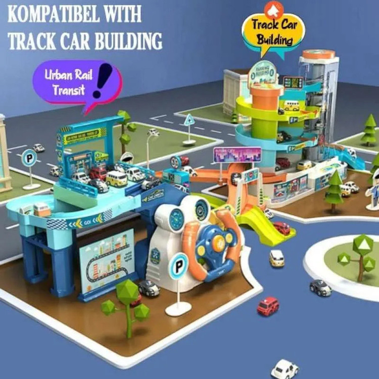 شامل: پارکینگ، 4 عدد ماشین کوچک، فرمان، مسیر اتصال، برچسب ها، مسیر U شکل، بیلبورد، علائم ترافیکی، رمپ، صفحه بازی و...