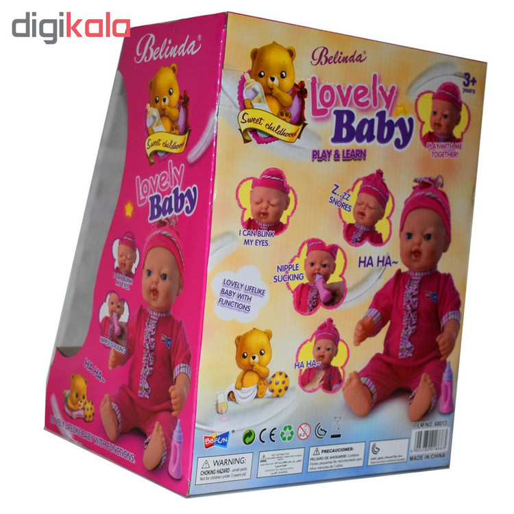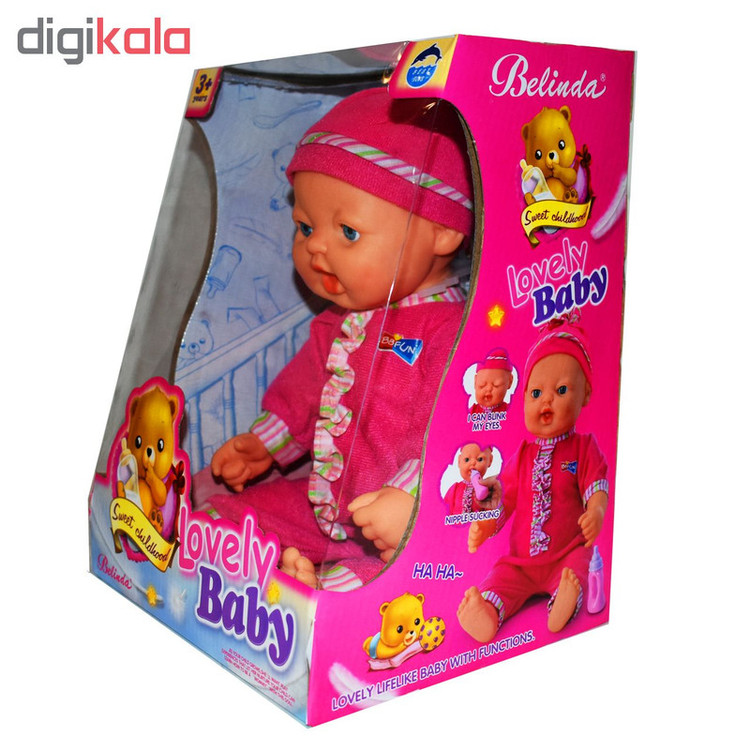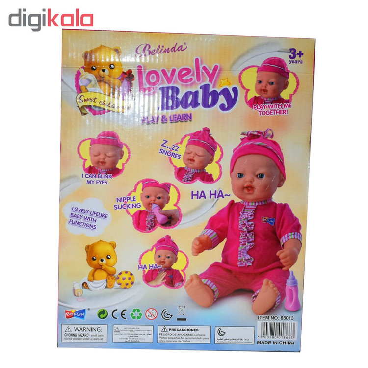 - بسته فاقد باطری - مناسب برای کودکان بالای سه سال - قابلیت حرکت صورت - قابلیت باز و بسته کردن چشم ها - شیشه شیر به صورت نمادین در دهان عروسک قرار می گیرد