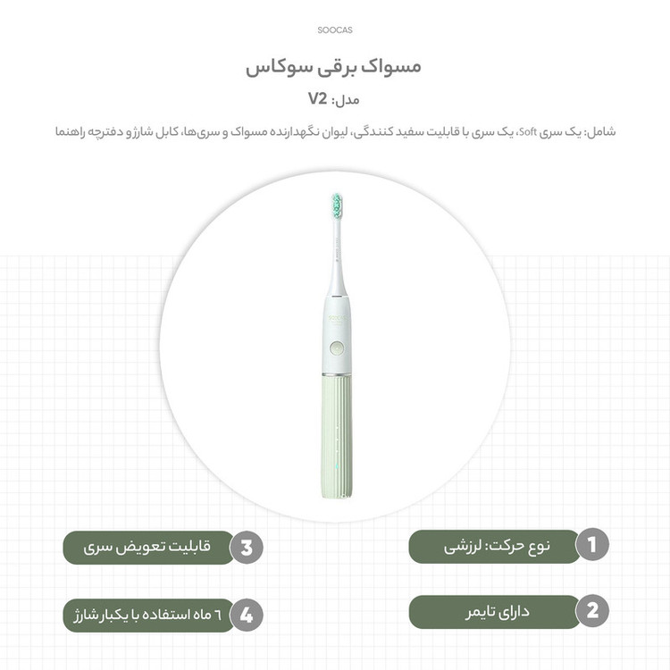 اقلام همراه: یک سری Soft برای اوایل استفاده یا برای افراد با لثه حساس و یک سری با قابلیت سفید کنندگی