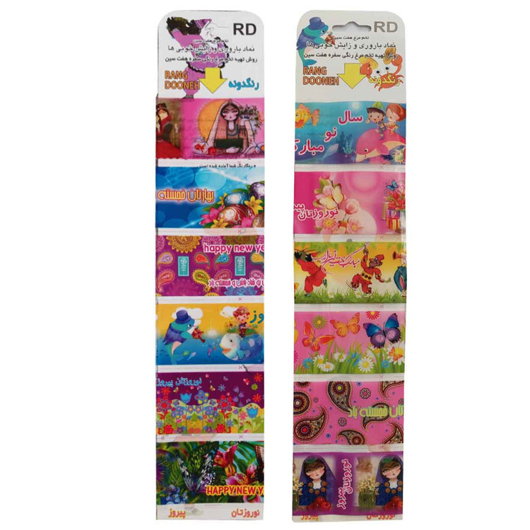 ابعاد هر برچسب 7x4 سانتی متر می باشد/نحوه ی چسباندن برچسب روی تخم مرغ روی مقوا درج شده