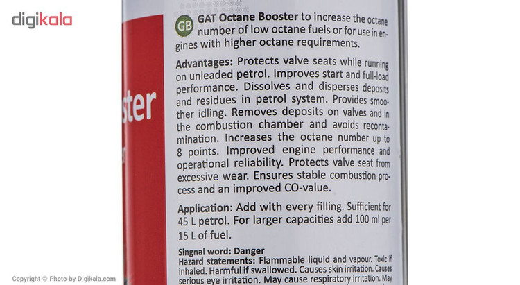استفاده از سوخت مناسب برای بالا بردن راندمان موتور خودرو بسیار ضروری است. این موضوع نه تنها در عملکرد بهتر فرایند احتراق نقش موثری دارد، بلکه در میزان کاهش آلایندههای خروجی از اگزوز نیز به خوبی عمل میکند. با استفاده از محصول فوق میتوانید کیفیت سوخت خودروی خود را افزایش دهید. این محصول نوعی اکتان بوستر بوده که موجب بالا رفتن عدد اکتان بنزین به مقدار 8 واحد میشود؛ از سویی دیگر میتواند رسوبات سیستم احتراق را تمیز کند. بالا بودن عدد اکتان به منزلهی احتراق بهتر و کاملتر خواهد بود؛ در نتیجه بنزین به صورت کامل در محفظهی احتراق میسوزد و شاهد سوخت ناقص و تولید گاز مونوکسید کربن که ناشی از این نوع احتراق است نخواهیم بود. احتراق کامل سوخت مزیت دیگری نیز داشته و آن کاهش میزان سوخت مصرفی خودرو است. در صورت استفاده از این اکتان بوستر شتاب خودروی شما نیز افزایش پیدا کرده و سیستم احتراق عملکرد بهتری خواهد داشت. این مکمل سوخت را شرکت «گات» تولید میکند. این محصول حجمی 300 میلیلیتری داشته و برای 45 لیتر بنزین در نظر گرفته شده است. این مکمل باید در حین سوختگیری به باک اضافه گردد.