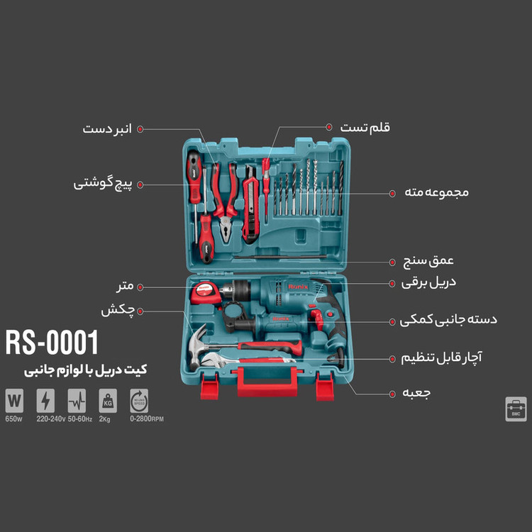 خط کش , پیچ گوشتی , دسته , کیف , مته , آچار , سر پیچ گوشتی , دفترچهی راهنما